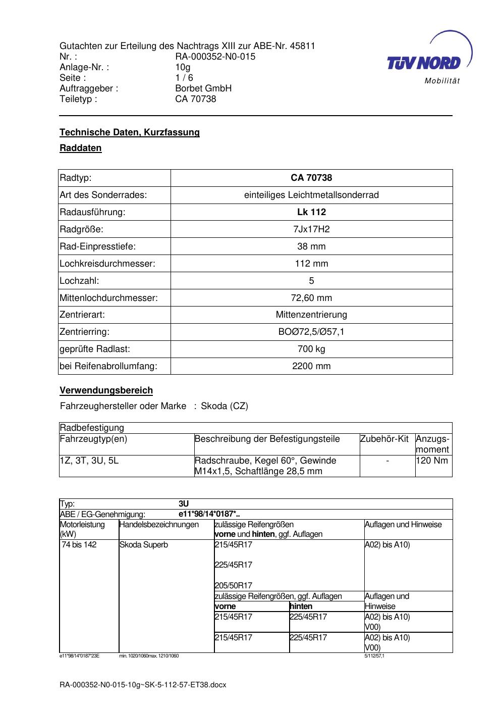 Dieses Gutachten (abe) bezieht sich auf die Alufelge Borbet CA 70738 in der Ausführung 7Jx17 ET 0, Mittenloch 0 mm (KBA 45811). Im PDF findest du typischerweise zulässige Reifengrößen, Auflagen/Anbauhinweise und – je nach Dokument – Hinweise zur Eintragung.