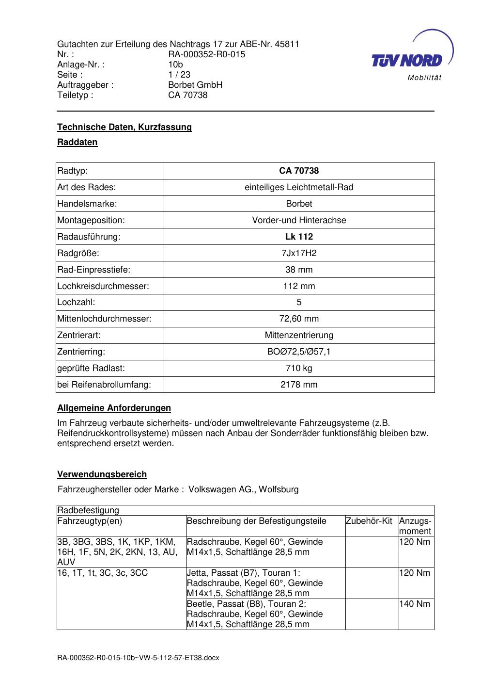 Dieses Gutachten (abe) bezieht sich auf die Alufelge Borbet CA 70738 in der Ausführung 7Jx17 ET 0, Mittenloch 0 mm (KBA 45811). Im PDF findest du typischerweise zulässige Reifengrößen, Auflagen/Anbauhinweise und – je nach Dokument – Hinweise zur Eintragung.