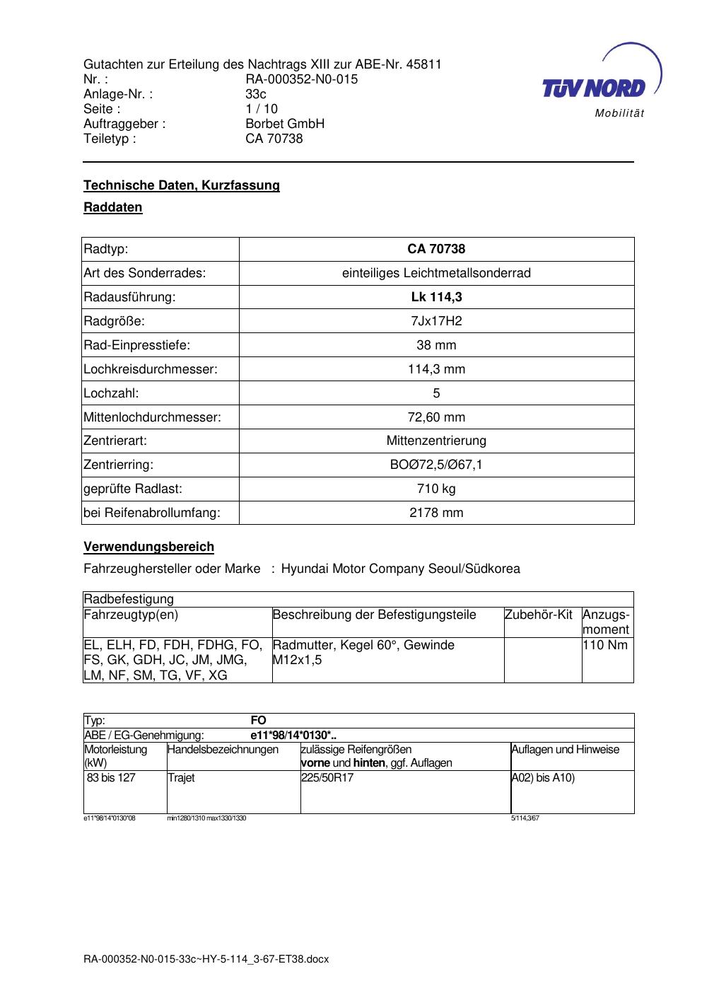 Dieses Gutachten (abe) bezieht sich auf die Alufelge Borbet CA 70738 in der Ausführung 7Jx17 ET 0, Mittenloch 0 mm (KBA 45811). Im PDF findest du typischerweise zulässige Reifengrößen, Auflagen/Anbauhinweise und – je nach Dokument – Hinweise zur Eintragung.