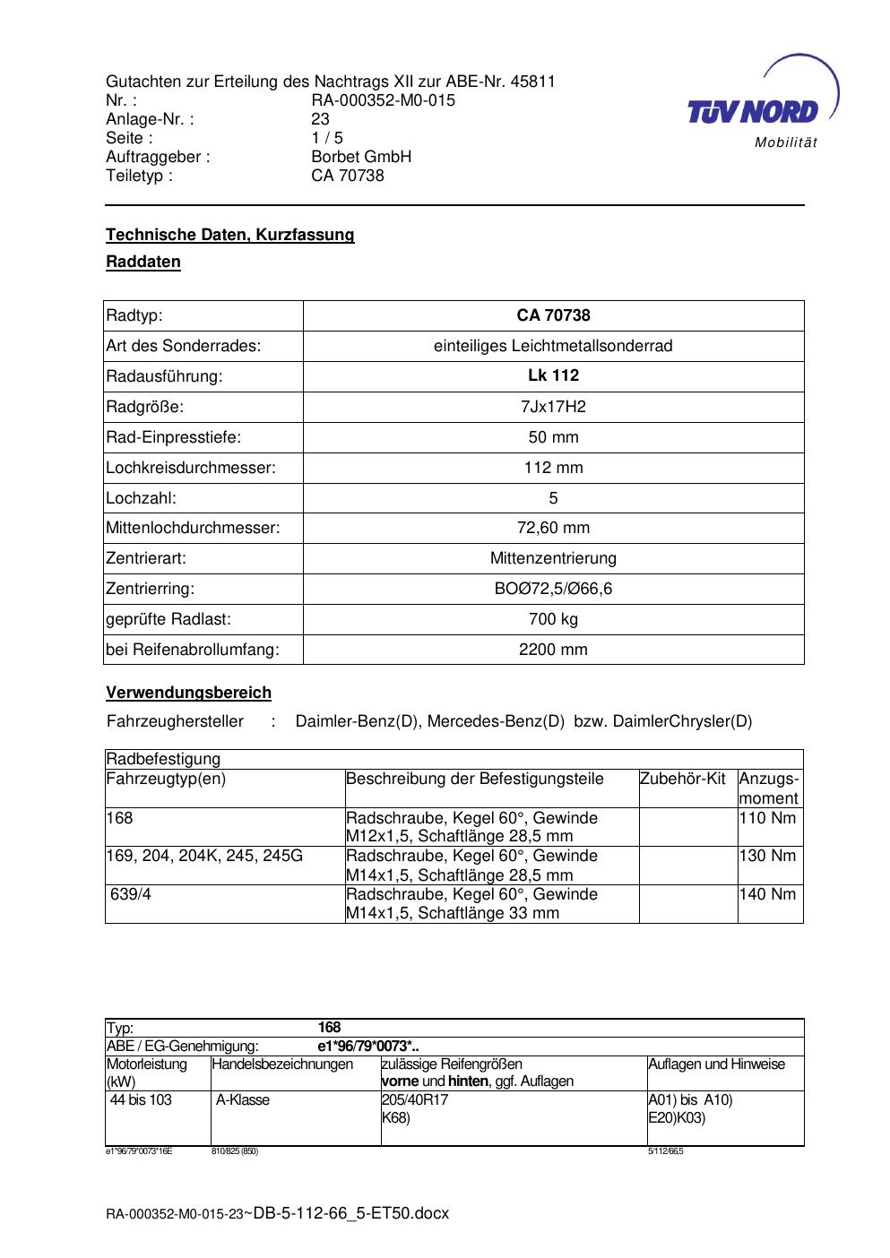 Dieses Gutachten (abe) bezieht sich auf die Alufelge Borbet CA 70738 in der Ausführung 7Jx17 ET 0, Mittenloch 0 mm (KBA 45811). Im PDF findest du typischerweise zulässige Reifengrößen, Auflagen/Anbauhinweise und – je nach Dokument – Hinweise zur Eintragung.