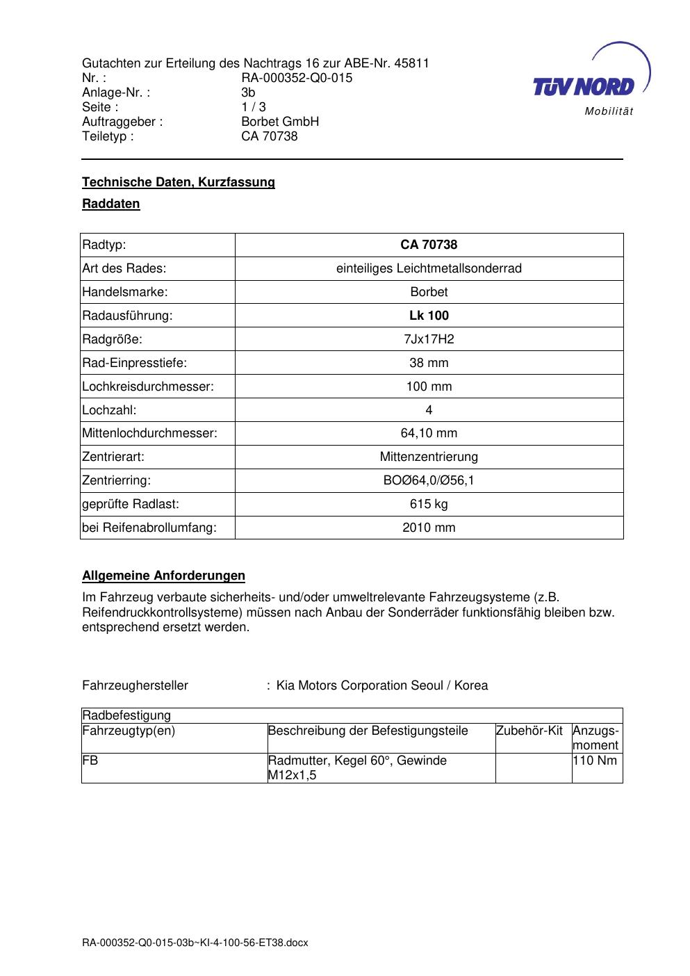 Dieses Gutachten (abe) bezieht sich auf die Alufelge Borbet CA 70738 in der Ausführung 7Jx17 ET 0, Mittenloch 0 mm (KBA 45811). Im PDF findest du typischerweise zulässige Reifengrößen, Auflagen/Anbauhinweise und – je nach Dokument – Hinweise zur Eintragung.