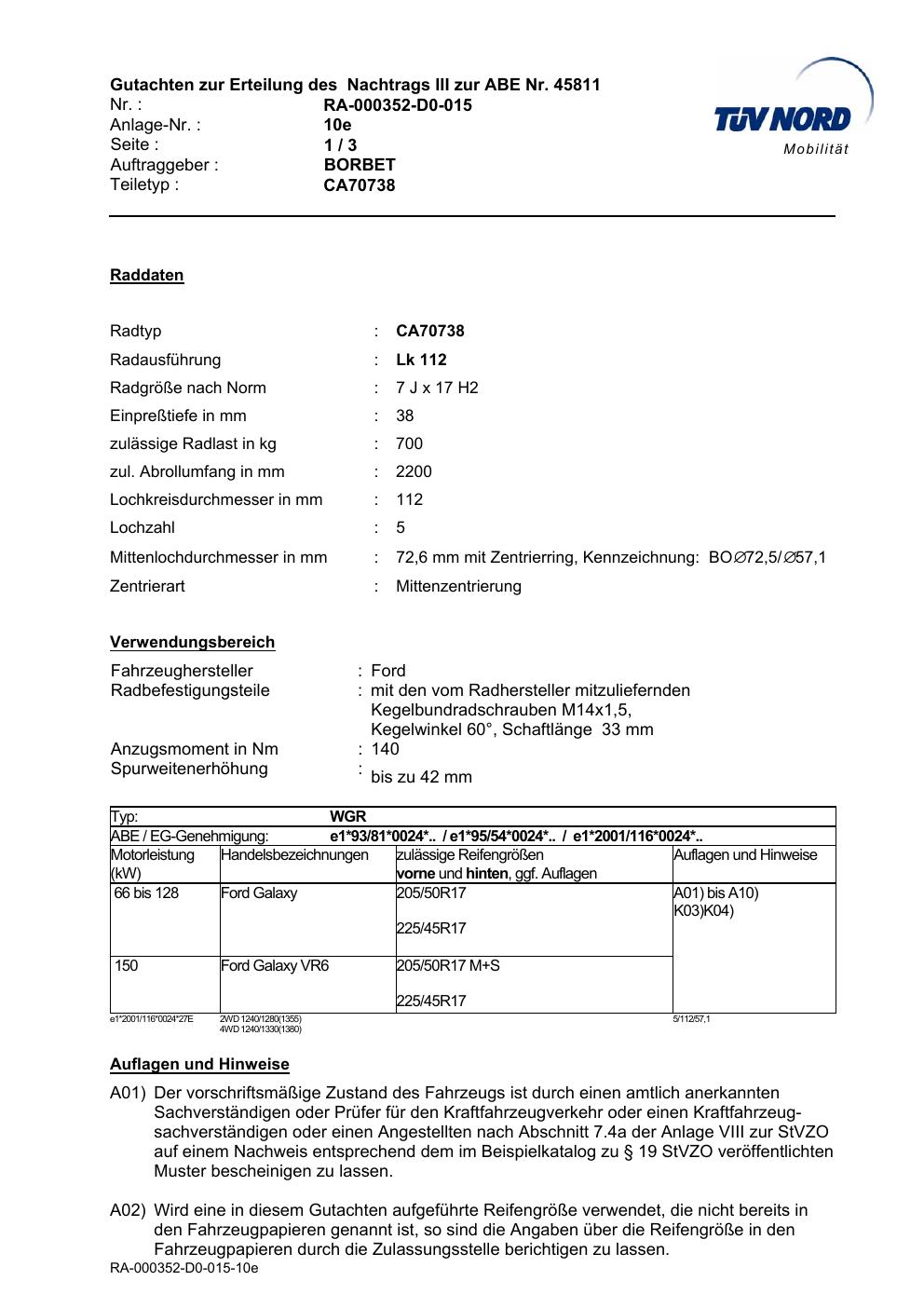 Dieses Gutachten (abe) bezieht sich auf die Alufelge Borbet CA70738 in der Ausführung 7Jx17 ET 0, Mittenloch 0 mm (KBA 45811). Im PDF findest du typischerweise zulässige Reifengrößen, Auflagen/Anbauhinweise und – je nach Dokument – Hinweise zur Eintragung.