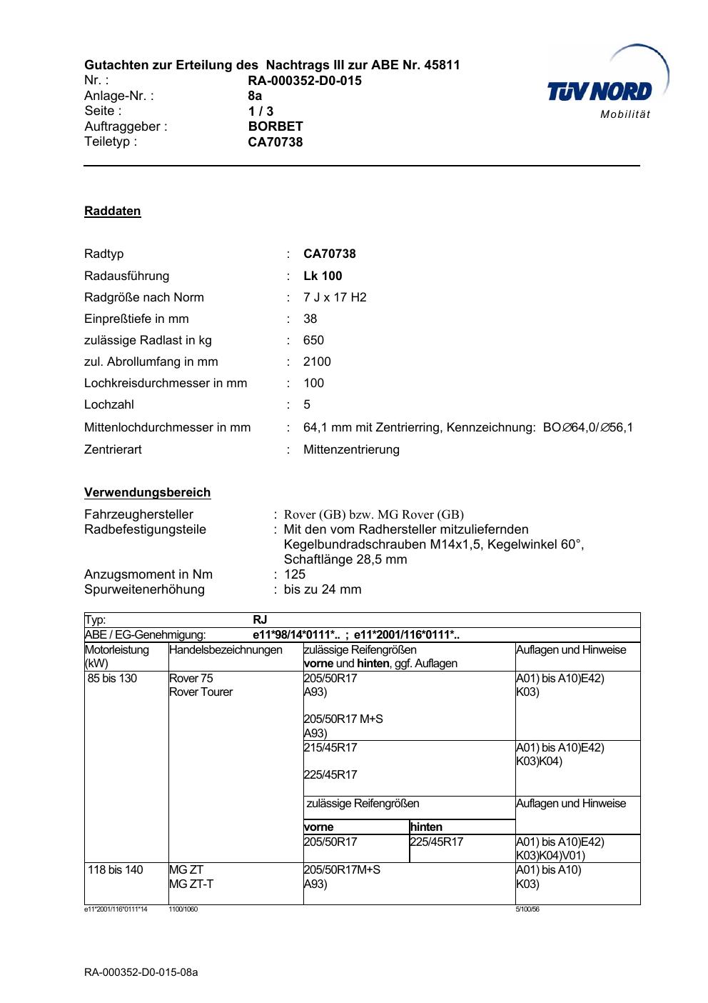 Dieses Gutachten (abe) bezieht sich auf die Alufelge brand-borbet CA70738 in der Ausführung 7Jx17 ET 0, Mittenloch 0 mm (KBA 45811). Im PDF findest du typischerweise zulässige Reifengrößen, Auflagen/Anbauhinweise und – je nach Dokument – Hinweise zur Eintragung.