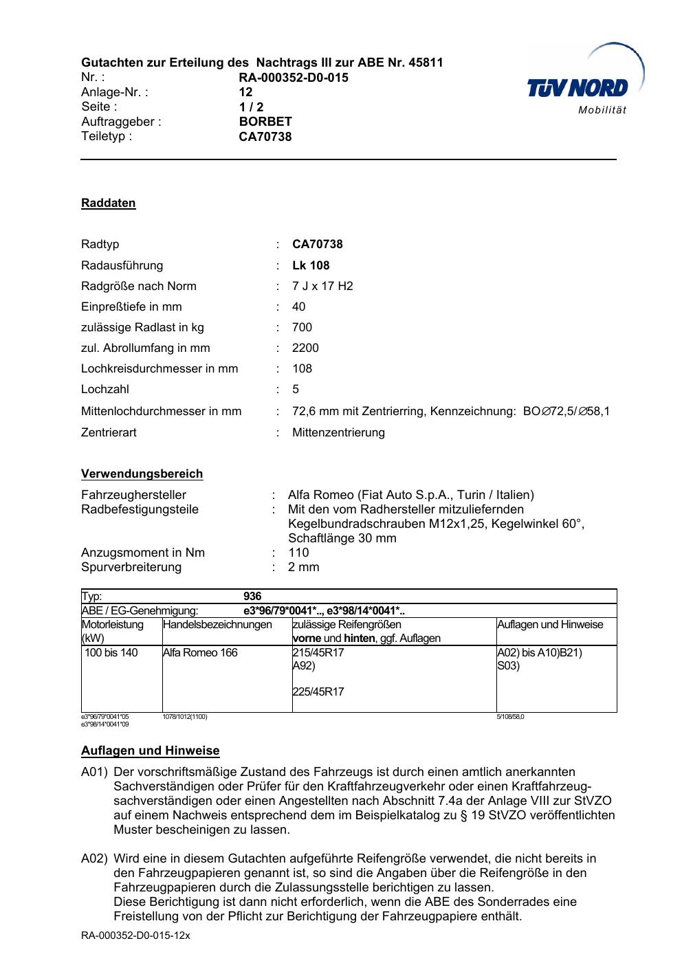 Dieses Gutachten (abe) bezieht sich auf die Alufelge Borbet CA70738 in der Ausführung 7Jx17 ET 0, Mittenloch 0 mm (KBA 45811). Im PDF findest du typischerweise zulässige Reifengrößen, Auflagen/Anbauhinweise und – je nach Dokument – Hinweise zur Eintragung.