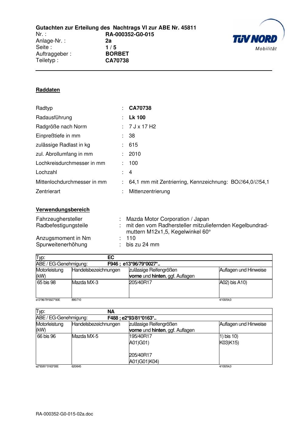 Dieses Gutachten (abe) bezieht sich auf die Alufelge brand-borbet CA70738 in der Ausführung 7Jx17 ET 0, Mittenloch 0 mm (KBA 45811). Im PDF findest du typischerweise zulässige Reifengrößen, Auflagen/Anbauhinweise und – je nach Dokument – Hinweise zur Eintragung.