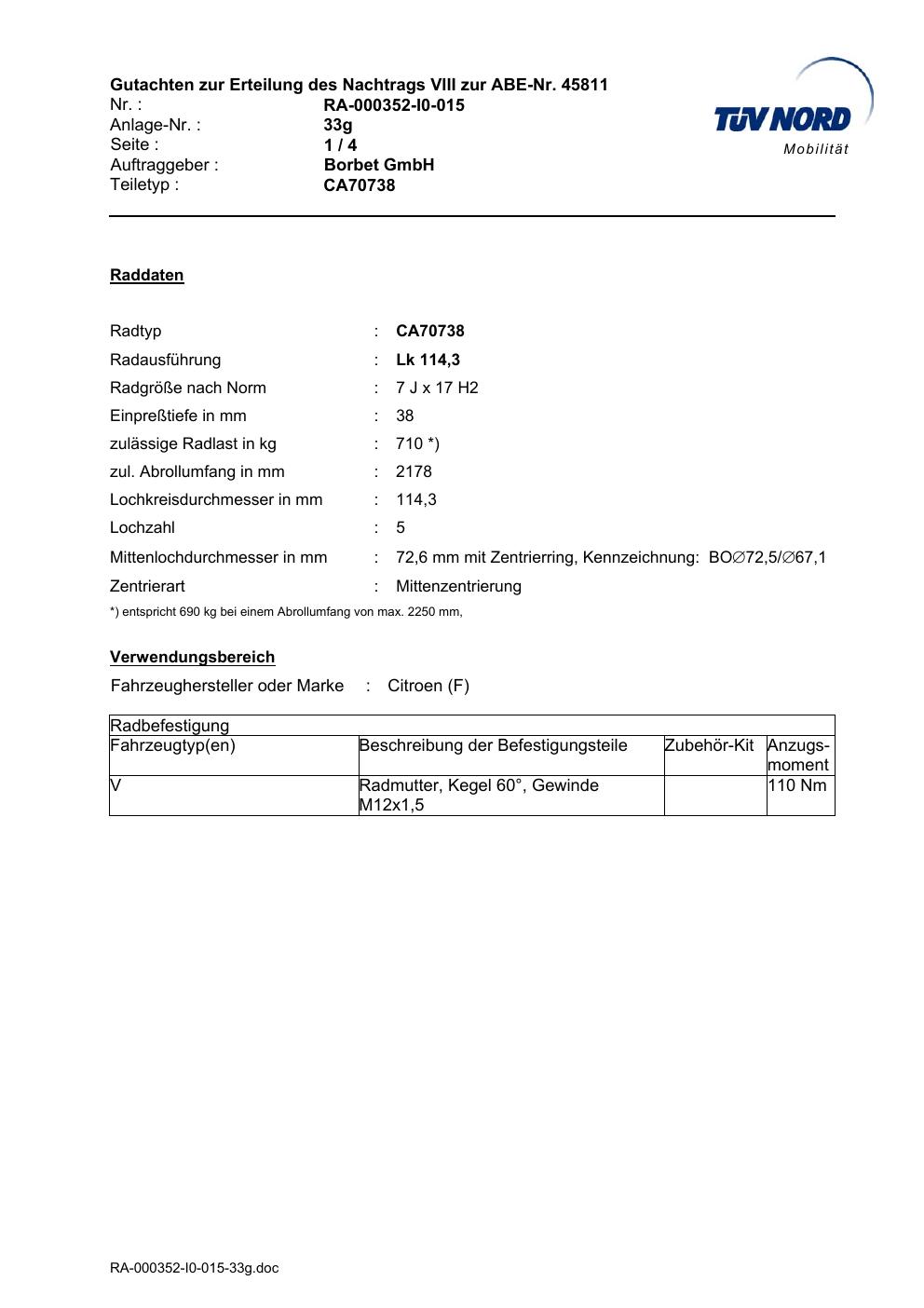 Dieses Gutachten (abe) bezieht sich auf die Alufelge Borbet CA70738 in der Ausführung 7Jx17 ET 0, Mittenloch 0 mm (KBA 45811). Im PDF findest du typischerweise zulässige Reifengrößen, Auflagen/Anbauhinweise und – je nach Dokument – Hinweise zur Eintragung.