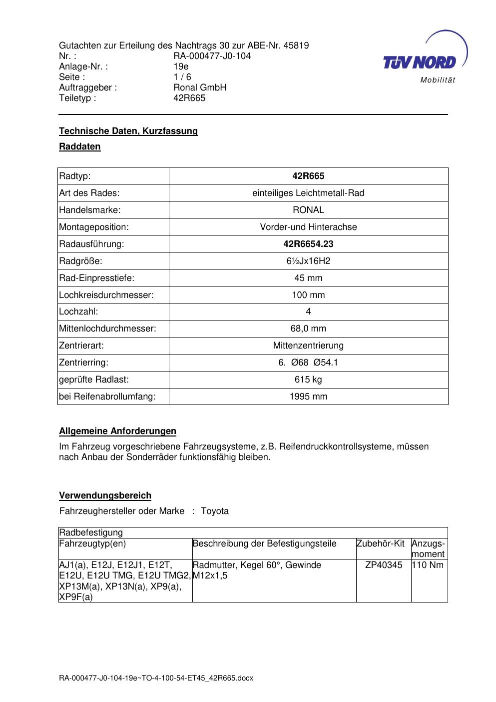 Dieses Gutachten (abe) bezieht sich auf die Alufelge ATS 42R665 in der Ausführung ET 0, Mittenloch 0 mm (KBA 45819). Im PDF findest du typischerweise zulässige Reifengrößen, Auflagen/Anbauhinweise und – je nach Dokument – Hinweise zur Eintragung.