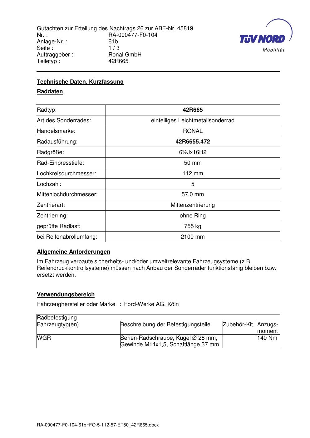 • Stimmt die KBA-Nummer auf der Felge mit diesem Dokument überein?