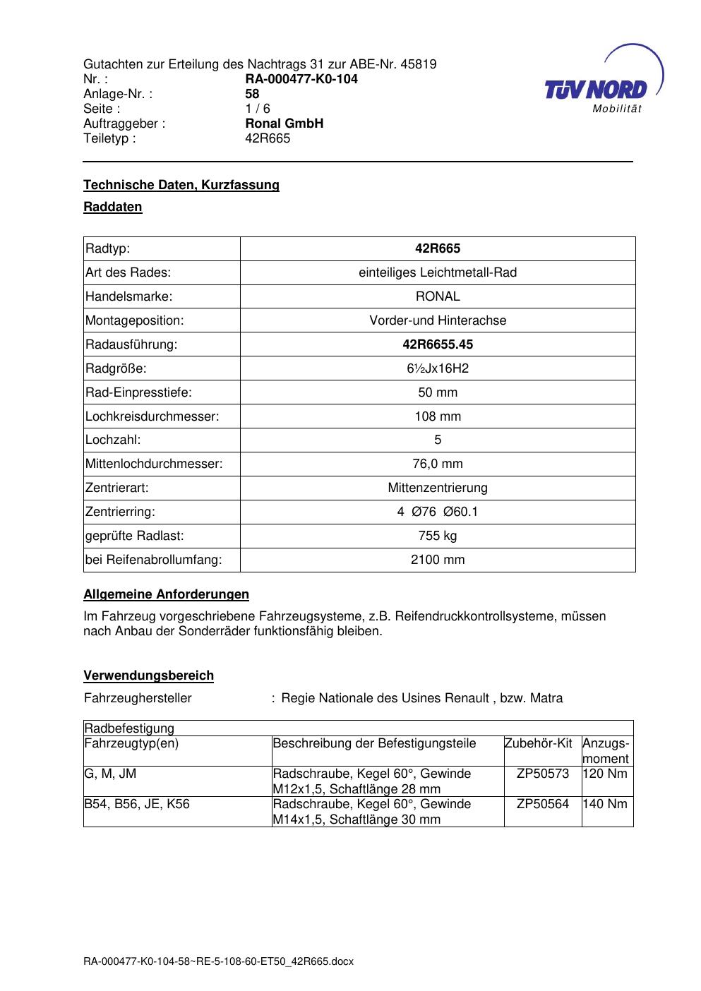 • Stimmt die KBA-Nummer auf der Felge mit diesem Dokument überein?
