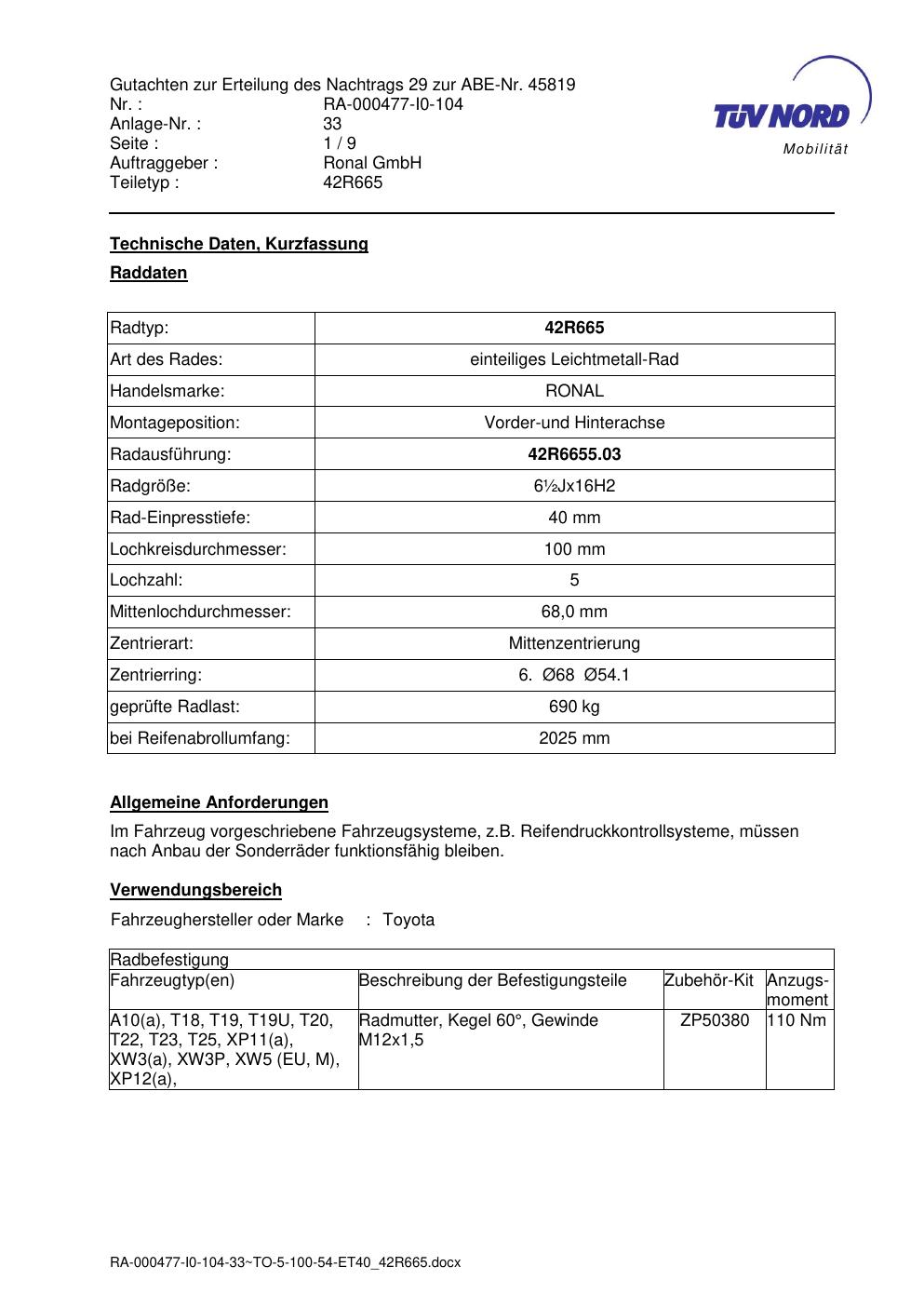 Dieses Gutachten (abe) bezieht sich auf die Alufelge Ronal 42R665 in der Ausführung ET 0, Mittenloch 0 mm (KBA 45819). Im PDF findest du typischerweise zulässige Reifengrößen, Auflagen/Anbauhinweise und – je nach Dokument – Hinweise zur Eintragung.