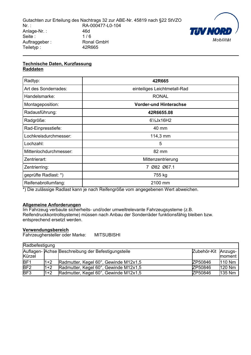 Dieses Gutachten (abe) bezieht sich auf die Alufelge Ronal 42R665 in der Ausführung ET 0, Mittenloch 0 mm (KBA 45819). Im PDF findest du typischerweise zulässige Reifengrößen, Auflagen/Anbauhinweise und – je nach Dokument – Hinweise zur Eintragung.