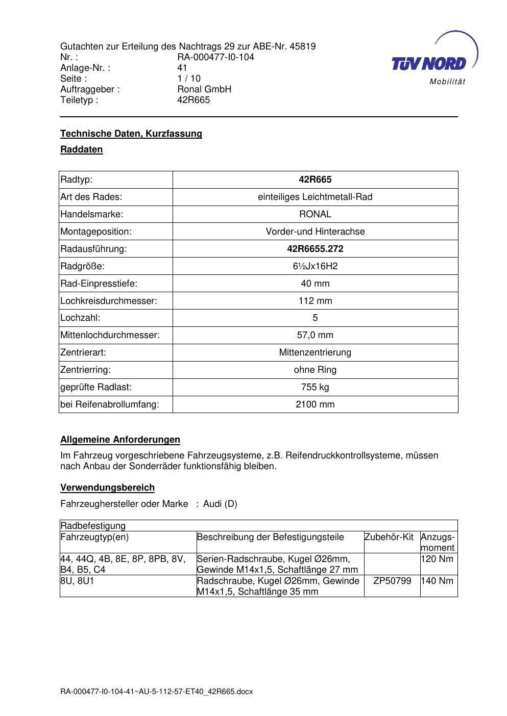 Dieses Gutachten (abe) bezieht sich auf die Alufelge Ronal 42R665 in der Ausführung 7Jx15 ET 0, Mittenloch 0 mm (KBA 45819). Im PDF findest du typischerweise zulässige Reifengrößen, Auflagen/Anbauhinweise und – je nach Dokument – Hinweise zur Eintragung.