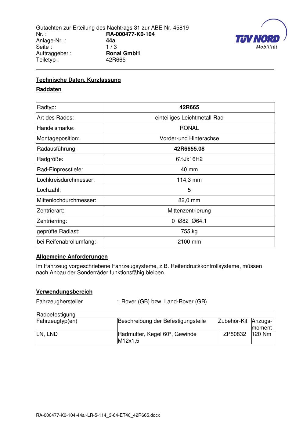 Dieses Gutachten (abe) bezieht sich auf die Alufelge Ronal 42R665 in der Ausführung ET 0, Mittenloch 0 mm (KBA 45819). Im PDF findest du typischerweise zulässige Reifengrößen, Auflagen/Anbauhinweise und – je nach Dokument – Hinweise zur Eintragung.