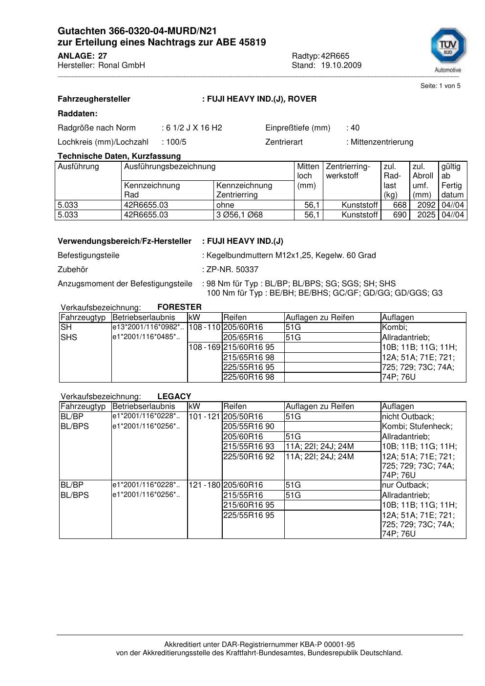Dieses Gutachten (abe) bezieht sich auf die Alufelge Ronal 42R665 in der Ausführung 2Jx16 ET 0, Mittenloch 0 mm (KBA 45819). Im PDF findest du typischerweise zulässige Reifengrößen, Auflagen/Anbauhinweise und – je nach Dokument – Hinweise zur Eintragung.