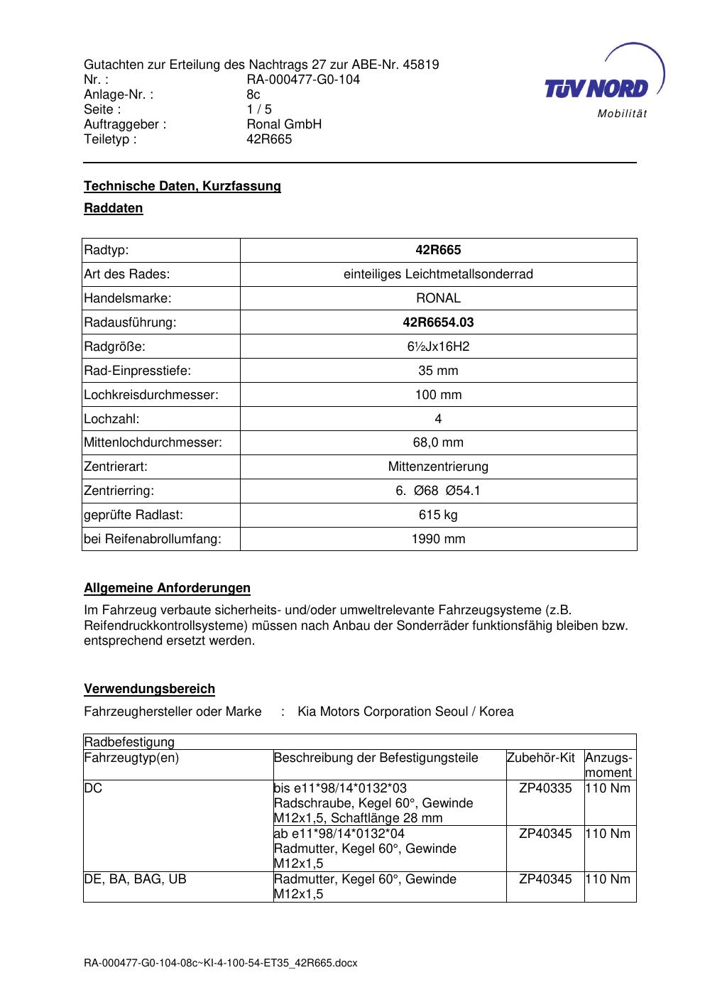 Diese Allgemeine Betriebserlaubnis (ABE) bezieht sich auf die Felge Ronal 42R665 in der Ausführung ET0 mit der KBA 45819. Eine ABE ist eine bauartspezifische Genehmigung, die der Hersteller beim Kraftfahrt-Bundesamt (KBA) erwirkt hat. Sie erlaubt die Verwendung der Felge an den im Dokument genannten Fahrzeugen ohne zusätzliche Einzelabnahme, solange sämtliche im Gutachten aufgeführten Auflagen eingehalten werden.