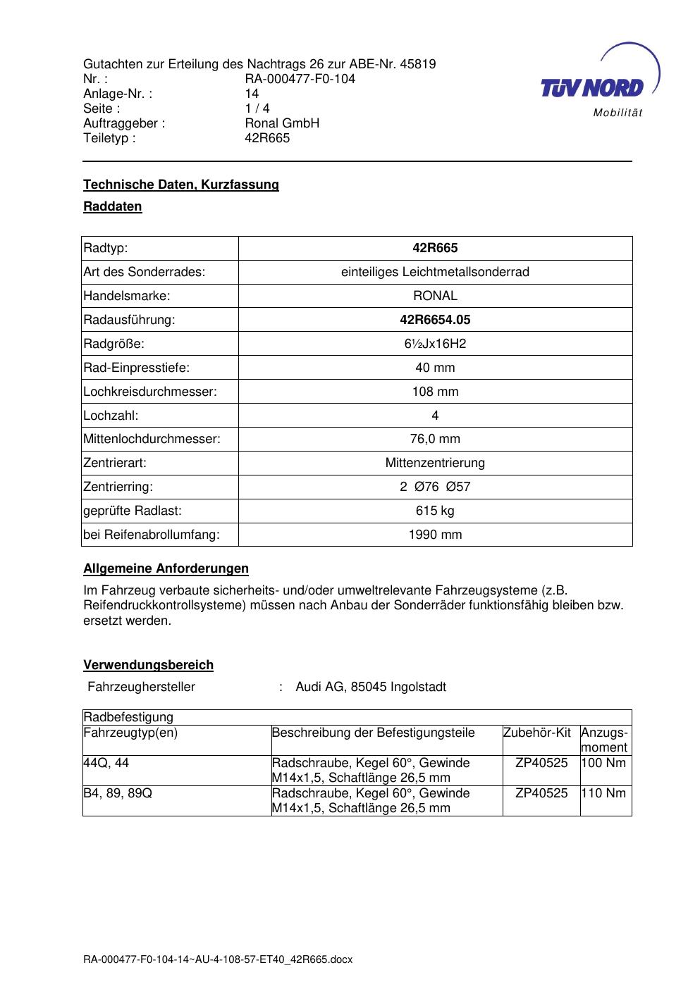 Dieses abe gehört zur Felge Ronal 42R665 in 7Jx15 ET0 mit KBA 45819. Die Seite ist dafür gedacht, dass du schnell prüfen kannst, ob KBA, Design und Größe zu deiner Felge passen und danach direkt das richtige PDF lädst.
