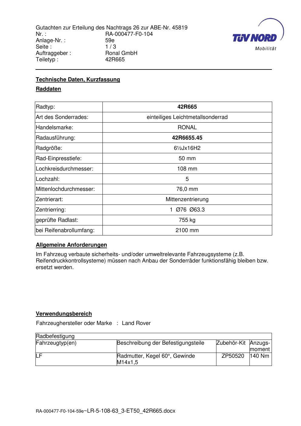 • Stimmt die KBA-Nummer auf der Felge mit diesem Dokument überein?