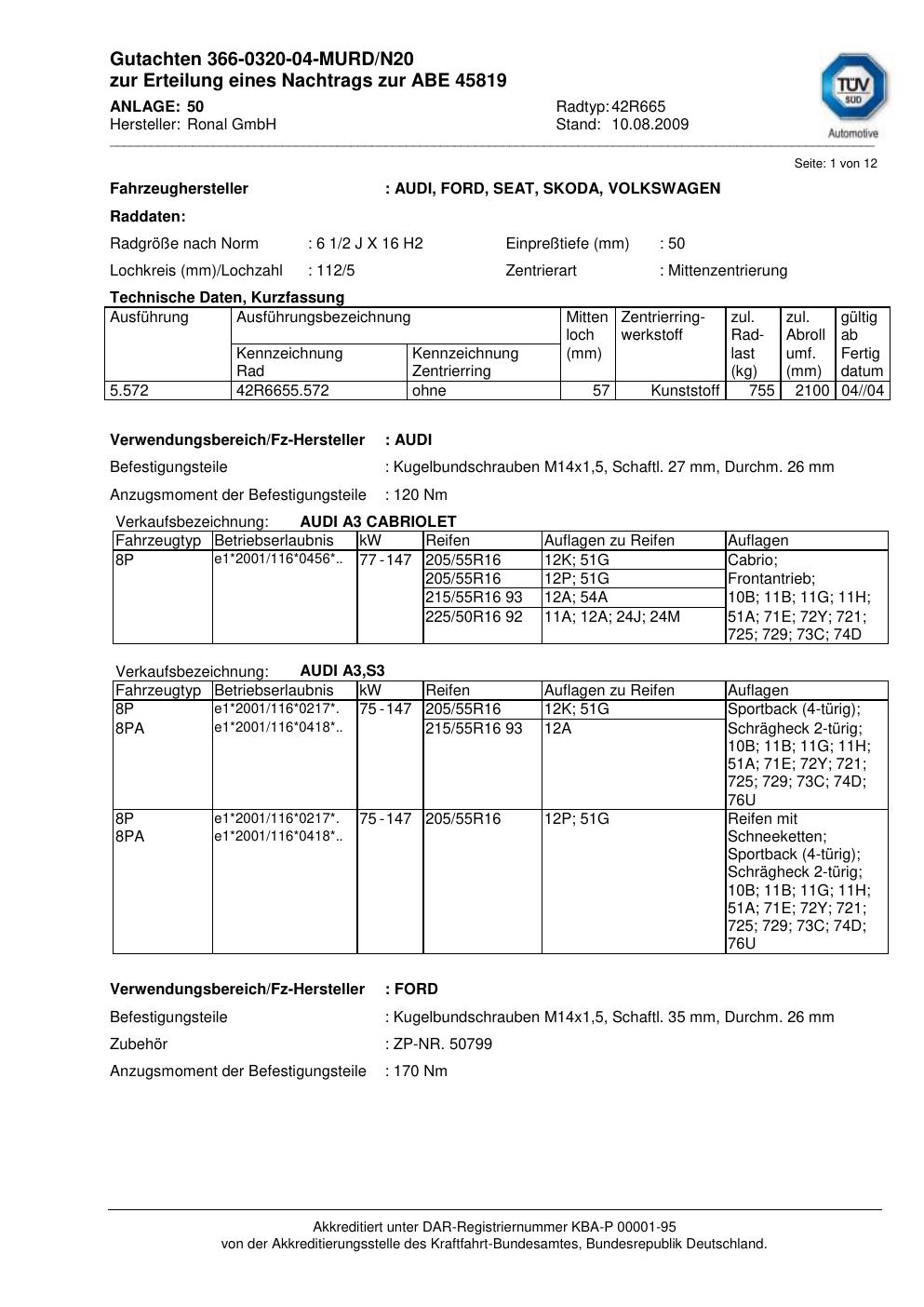 Dieses Gutachten (abe) bezieht sich auf die Alufelge Ronal 42R665 in der Ausführung 2Jx16 ET 0, Mittenloch 0 mm (KBA 45819). Im PDF findest du typischerweise zulässige Reifengrößen, Auflagen/Anbauhinweise und – je nach Dokument – Hinweise zur Eintragung.
