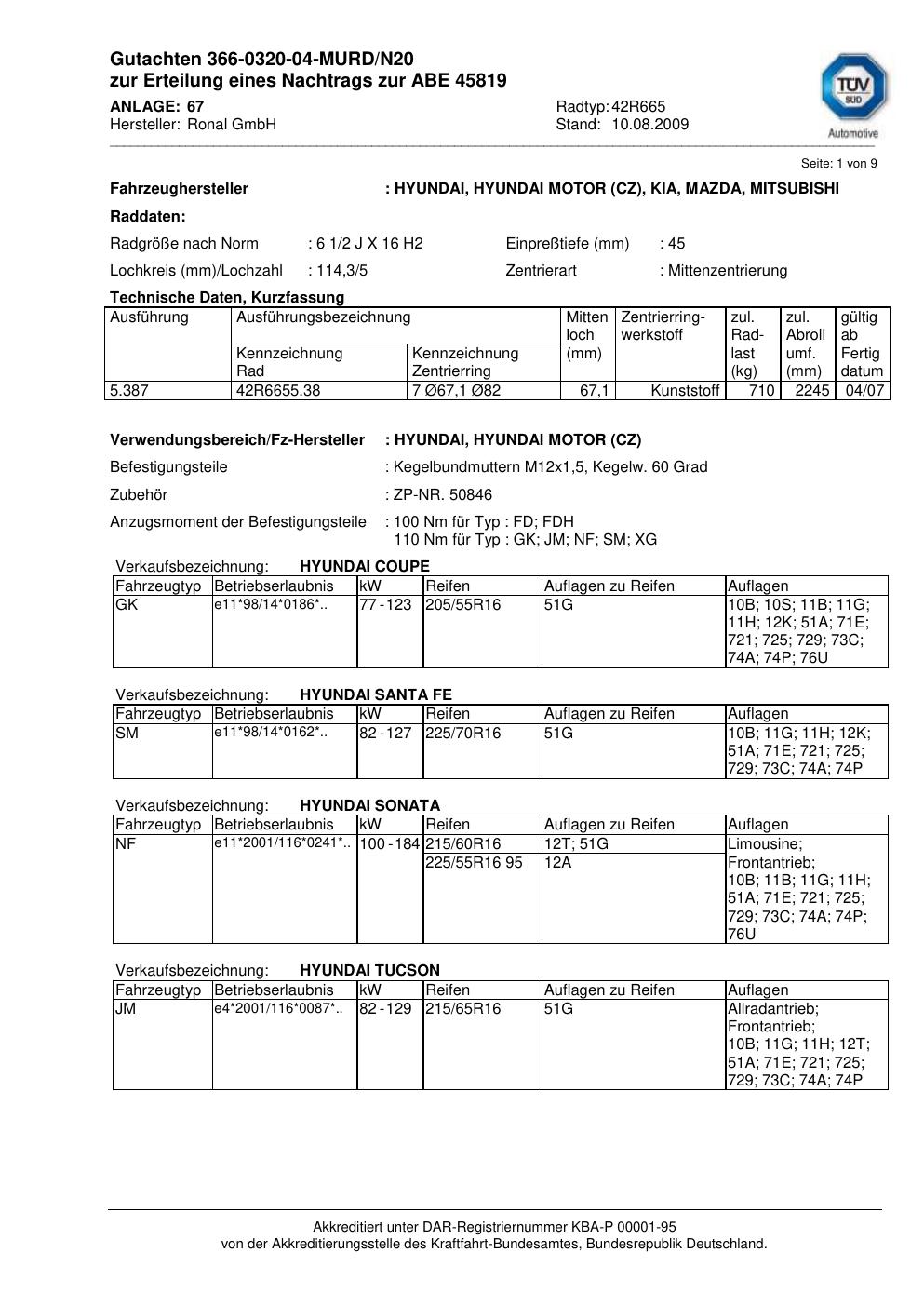 Felgengutachten / abe für Alufelgen Ronal 42R665 (2Jx16 ET 0, Mittenloch 0 mm) mit KBA 45819 (Zertifikatsnummer 45819). Hier kostenlos als PDF herunterladen. Der Download-Link ist 24 Stunden gültig und kann bis zu zwei Mal verwendet werden.