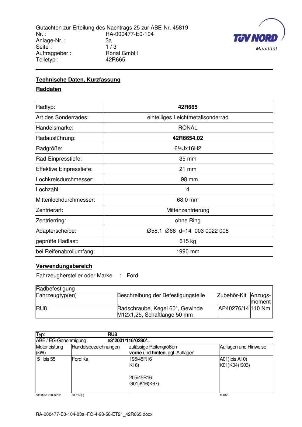 Dieses abe der Marke Ronal stammt vom jeweiligen Hersteller, Importeur oder einer Prüforganisation. Felgengutachten.de beansprucht hieran keine eigenen Urheber-, Nutzungs- oder sonstigen Schutzrechte. Soweit das Dokument urheber- oder leistungsschutzrechtlich geschützt ist, verbleiben die Rechte beim jeweiligen Rechteinhaber. Die Bereitstellung erfolgt ausschließlich zu Informationszwecken für Endnutzer, z. B. zur Vorlage bei Prüfstellen oder zur eigenen Fahrzeugdokumentation.