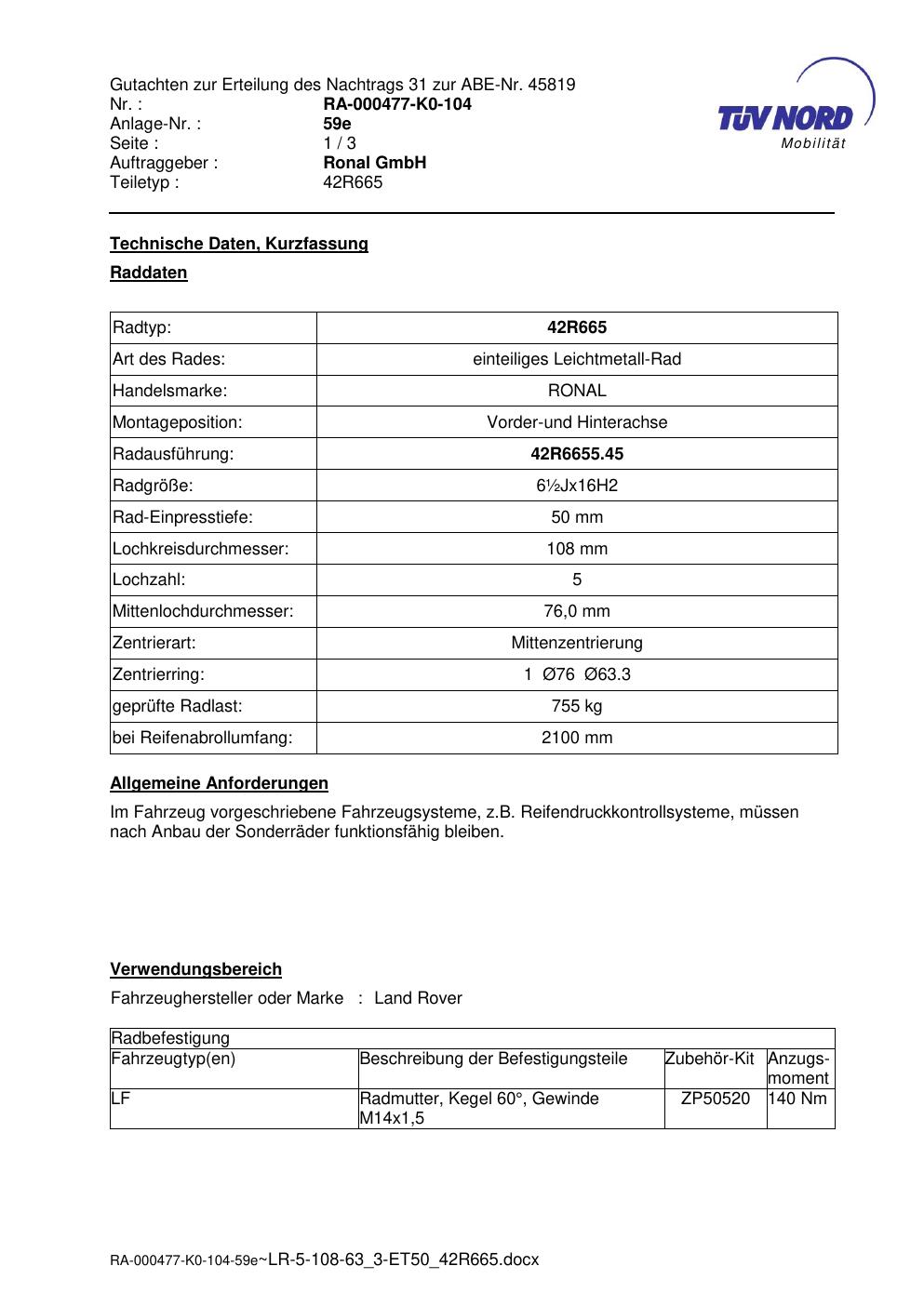 Diese Allgemeine Betriebserlaubnis (ABE) bezieht sich auf die Felge Ronal 42R665 in der Ausführung ET0 mit der KBA 45819. Eine ABE ist eine bauartspezifische Genehmigung, die der Hersteller beim Kraftfahrt-Bundesamt (KBA) erwirkt hat. Sie erlaubt die Verwendung der Felge an den im Dokument genannten Fahrzeugen ohne zusätzliche Einzelabnahme, solange sämtliche im Gutachten aufgeführten Auflagen eingehalten werden.