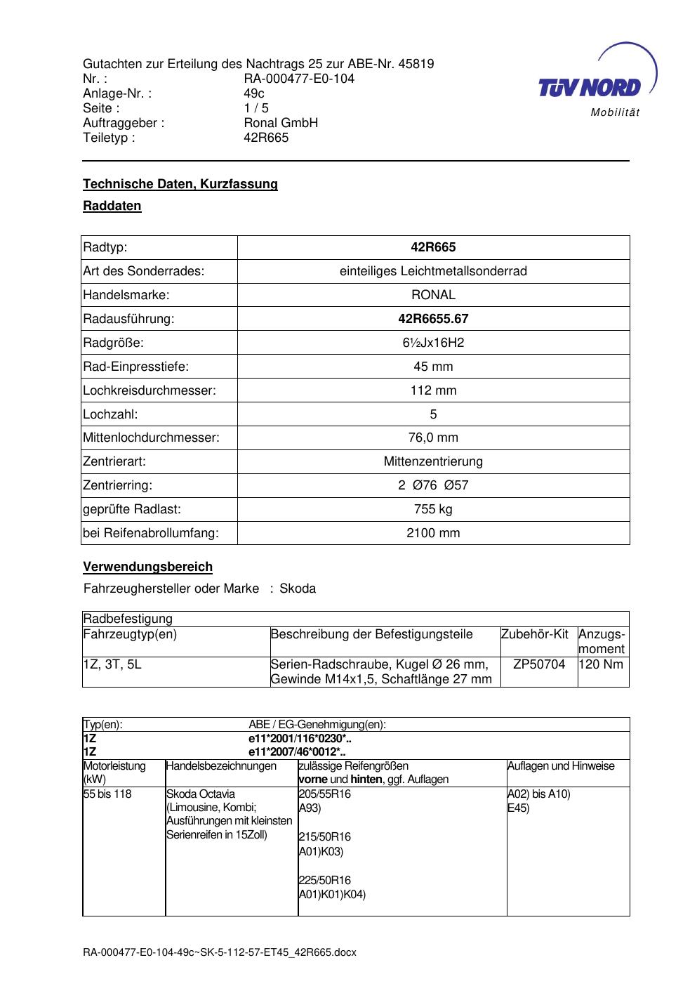 Dieses Gutachten (abe) bezieht sich auf die Alufelge Ronal 42R665 in der Ausführung ET 0, Mittenloch 0 mm (KBA 45819). Im PDF findest du typischerweise zulässige Reifengrößen, Auflagen/Anbauhinweise und – je nach Dokument – Hinweise zur Eintragung.