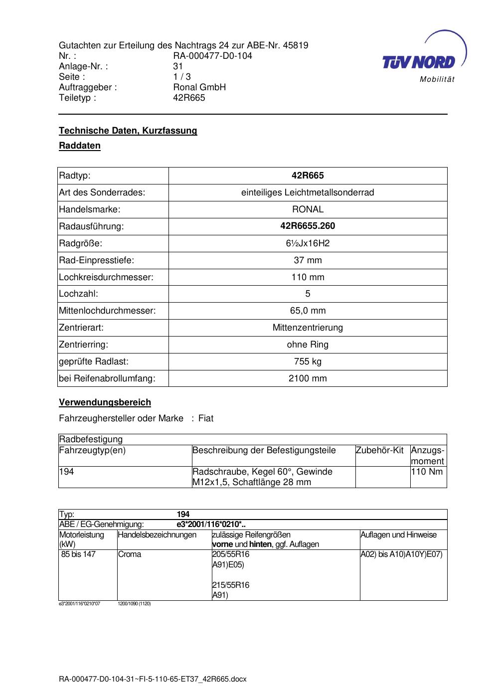• Stimmt die KBA-Nummer auf der Felge mit diesem Dokument überein?