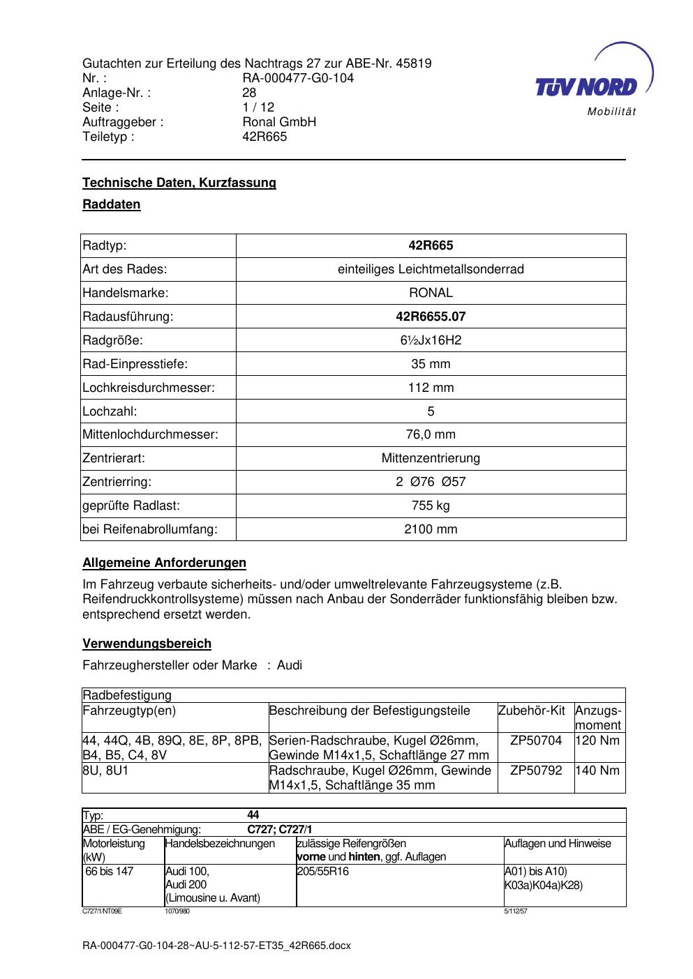 Dieses Gutachten (abe) bezieht sich auf die Alufelge Ronal 42R665 in der Ausführung 7Jx15 ET 0, Mittenloch 0 mm (KBA 45819). Im PDF findest du typischerweise zulässige Reifengrößen, Auflagen/Anbauhinweise und – je nach Dokument – Hinweise zur Eintragung.
