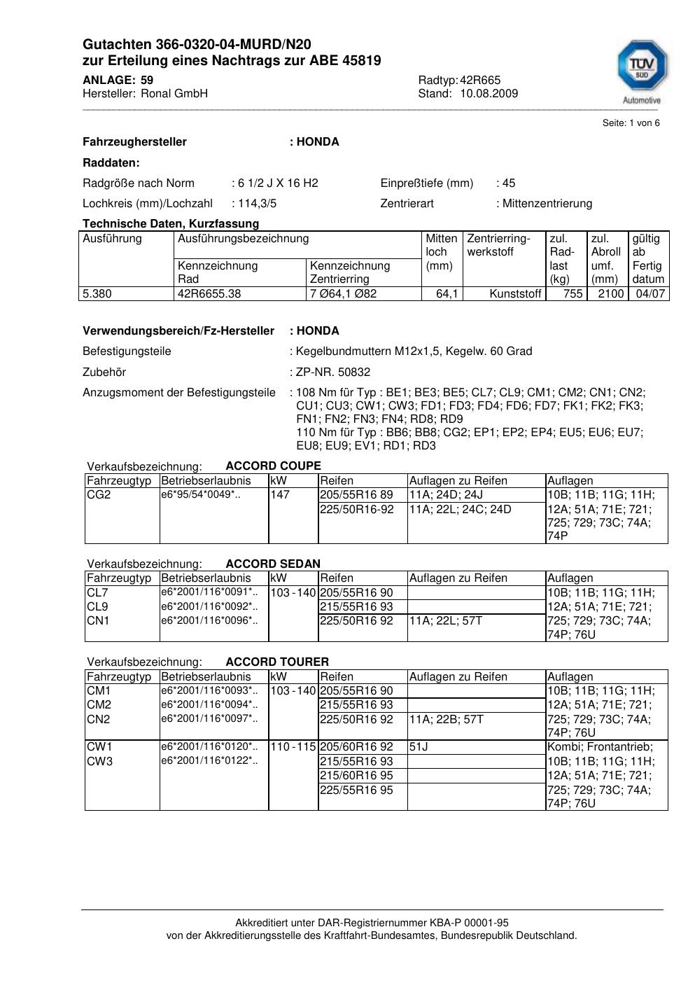Dieses Gutachten (abe) bezieht sich auf die Alufelge Ronal 42R665 in der Ausführung 2Jx16 ET 0, Mittenloch 0 mm (KBA 45819). Im PDF findest du typischerweise zulässige Reifengrößen, Auflagen/Anbauhinweise und – je nach Dokument – Hinweise zur Eintragung.