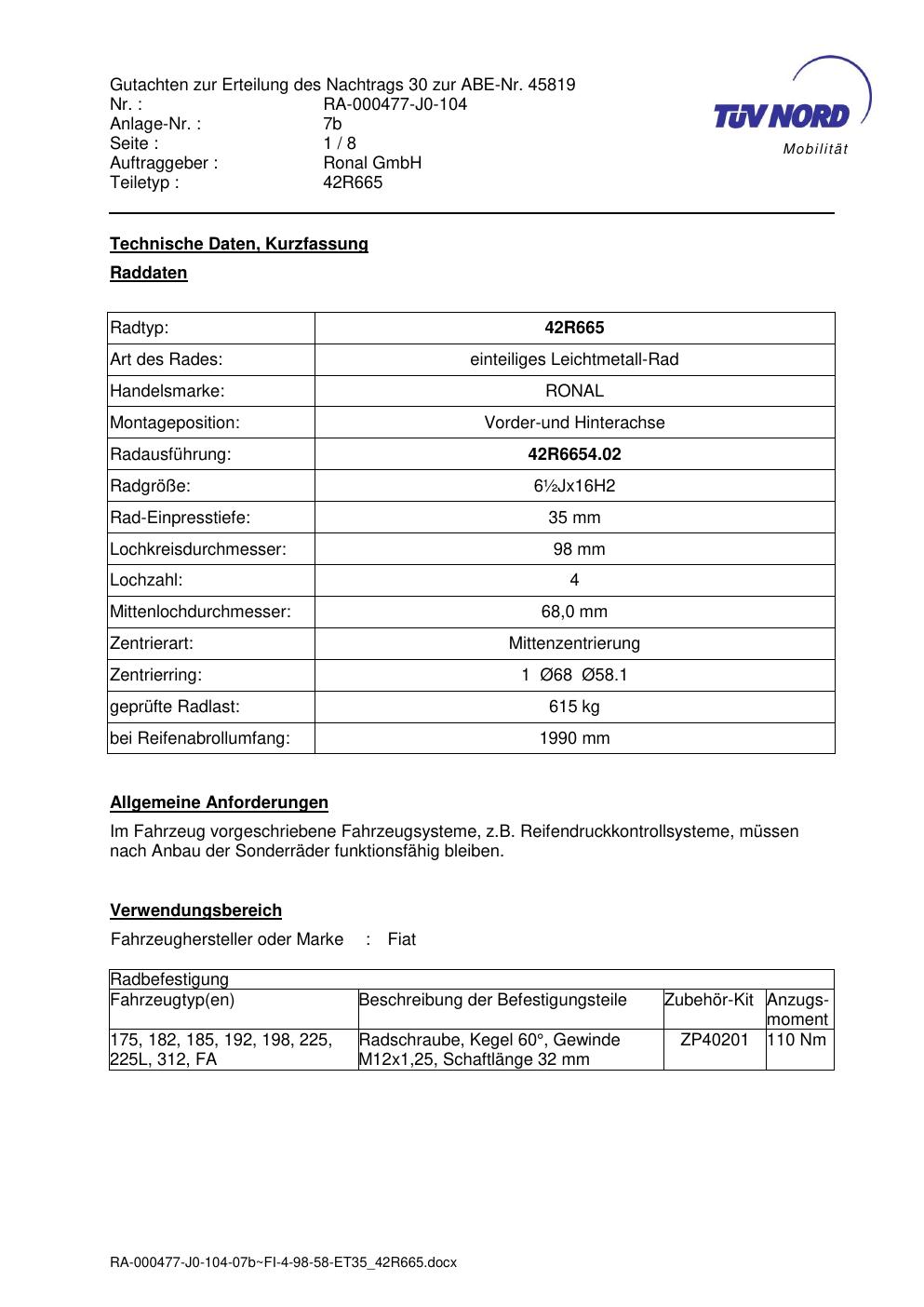 Dieses Gutachten (abe) bezieht sich auf die Alufelge Ronal 42R665 in der Ausführung ET 0, Mittenloch 0 mm (KBA 45819). Im PDF findest du typischerweise zulässige Reifengrößen, Auflagen/Anbauhinweise und – je nach Dokument – Hinweise zur Eintragung.