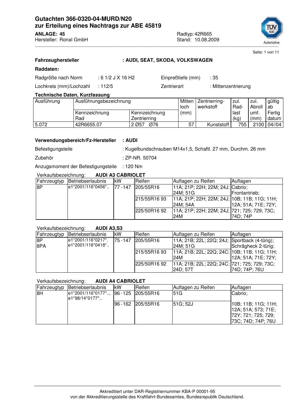 Dieses Gutachten (abe) bezieht sich auf die Alufelge Ronal 42R665 in der Ausführung 2Jx16 ET 0, Mittenloch 0 mm (KBA 45819). Im PDF findest du typischerweise zulässige Reifengrößen, Auflagen/Anbauhinweise und – je nach Dokument – Hinweise zur Eintragung.