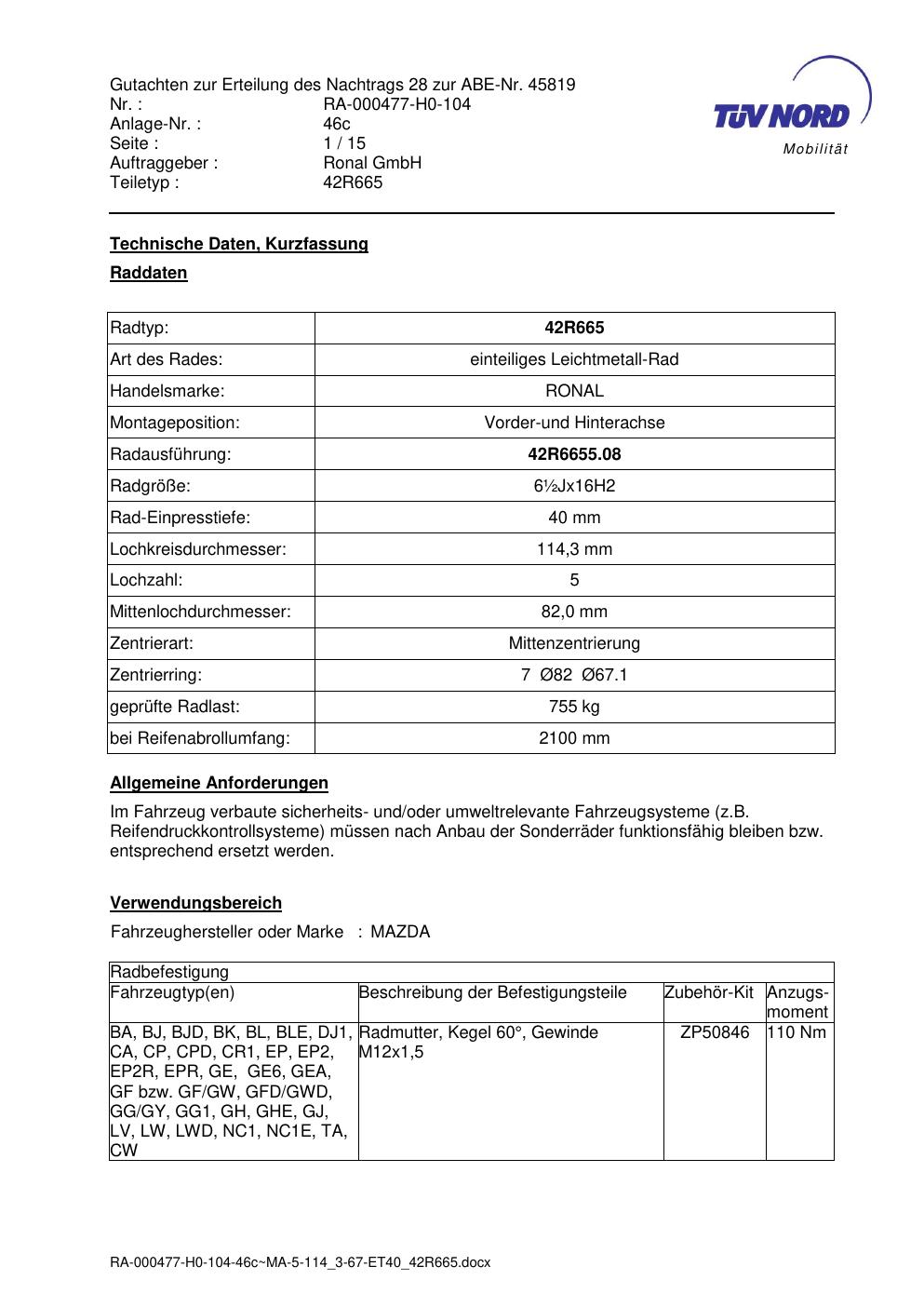 • Stimmt die KBA-Nummer auf der Felge mit diesem Dokument überein?
