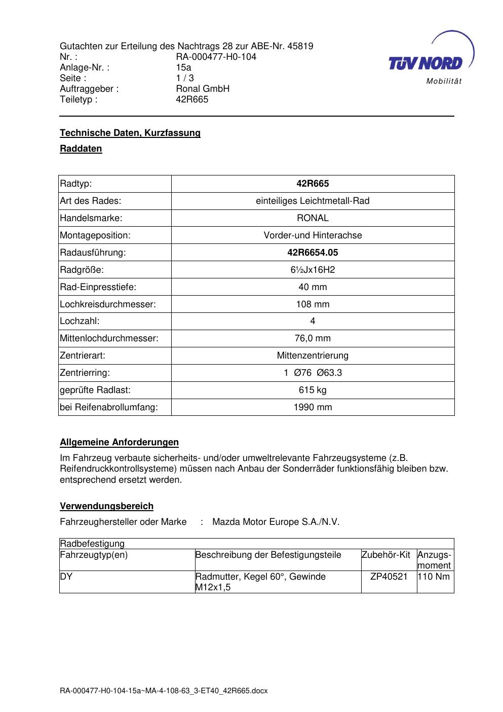 • Stimmt die KBA-Nummer auf der Felge mit diesem Dokument überein?