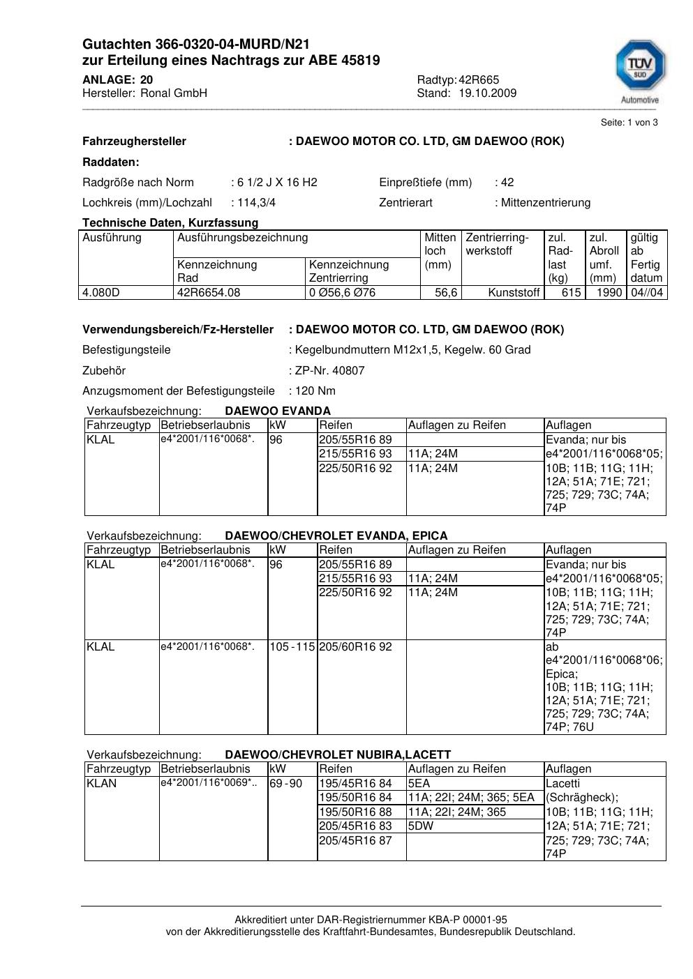 Dieses Gutachten (abe) bezieht sich auf die Alufelge Ronal 42R665 in der Ausführung 2Jx16 ET 0, Mittenloch 0 mm (KBA 45819). Im PDF findest du typischerweise zulässige Reifengrößen, Auflagen/Anbauhinweise und – je nach Dokument – Hinweise zur Eintragung.