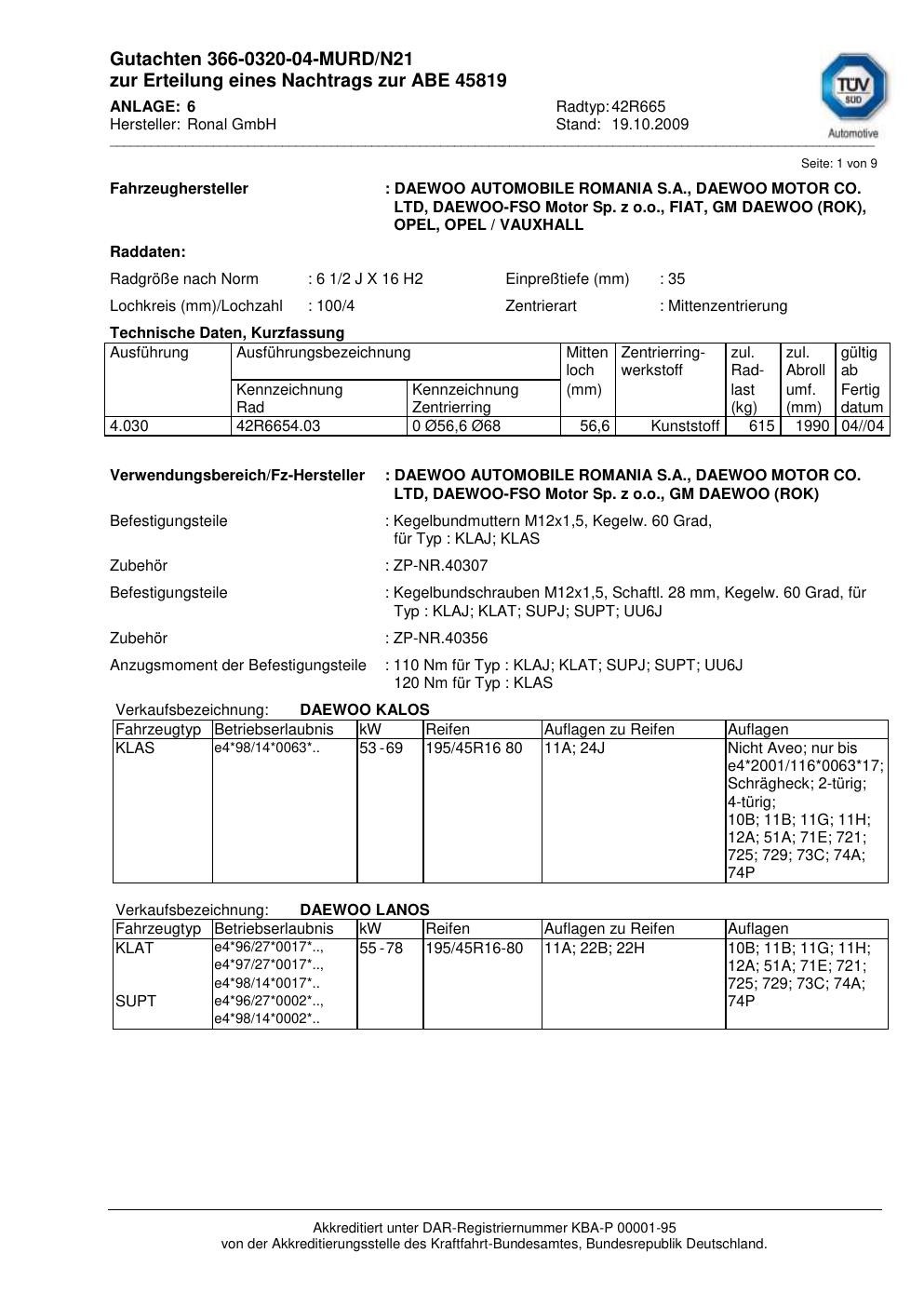 Dieses Gutachten (abe) bezieht sich auf die Alufelge Ronal 42R665 in der Ausführung 2Jx16 ET 0, Mittenloch 0 mm (KBA 45819). Im PDF findest du typischerweise zulässige Reifengrößen, Auflagen/Anbauhinweise und – je nach Dokument – Hinweise zur Eintragung.