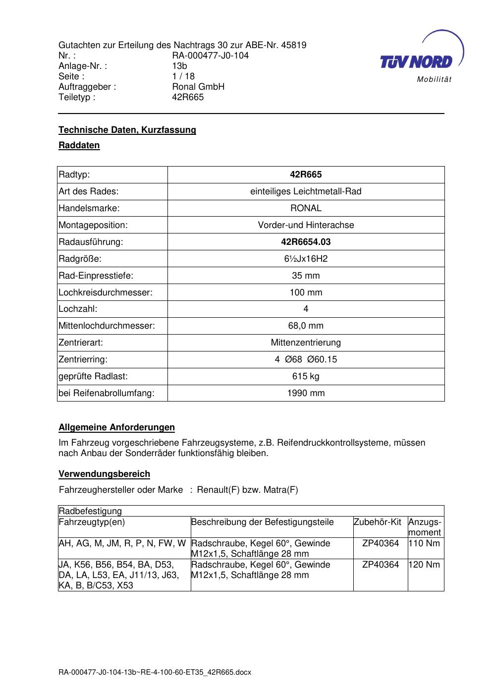 Diese Allgemeine Betriebserlaubnis (ABE) bezieht sich auf die Felge Ronal 42R665 in der Ausführung ET0 mit der KBA 45819. Eine ABE ist eine bauartspezifische Genehmigung, die der Hersteller beim Kraftfahrt-Bundesamt (KBA) erwirkt hat. Sie erlaubt die Verwendung der Felge an den im Dokument genannten Fahrzeugen ohne zusätzliche Einzelabnahme, solange sämtliche im Gutachten aufgeführten Auflagen eingehalten werden.