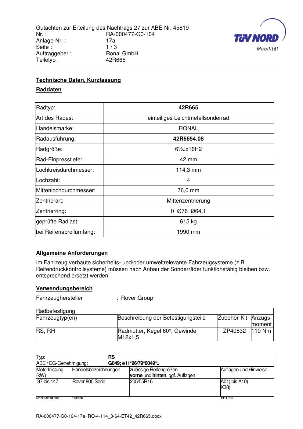 • Stimmt die KBA-Nummer auf der Felge mit diesem Dokument überein?