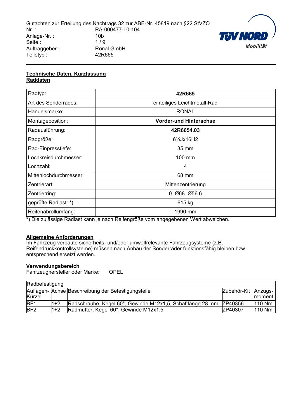 Dieses Gutachten (abe) bezieht sich auf die Alufelge Ronal 42R665 in der Ausführung ET 0, Mittenloch 0 mm (KBA 45819). Im PDF findest du typischerweise zulässige Reifengrößen, Auflagen/Anbauhinweise und – je nach Dokument – Hinweise zur Eintragung.