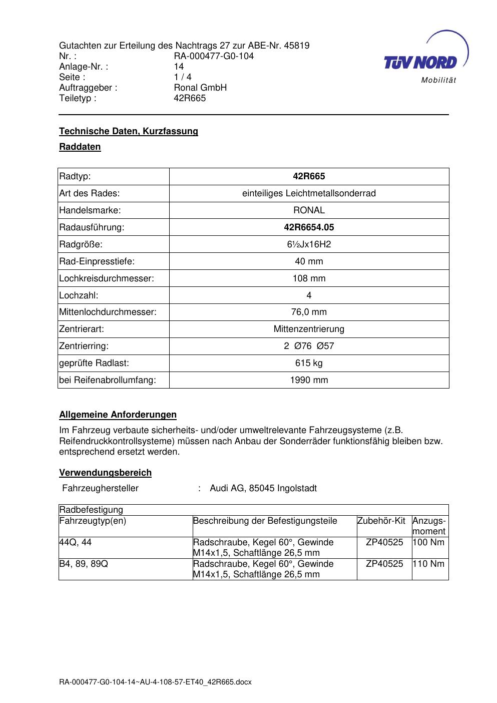 Dieses abe gehört zur Felge Ronal 42R665 in 7Jx15 ET0 mit KBA 45819. Die Seite ist dafür gedacht, dass du schnell prüfen kannst, ob KBA, Design und Größe zu deiner Felge passen und danach direkt das richtige PDF lädst.