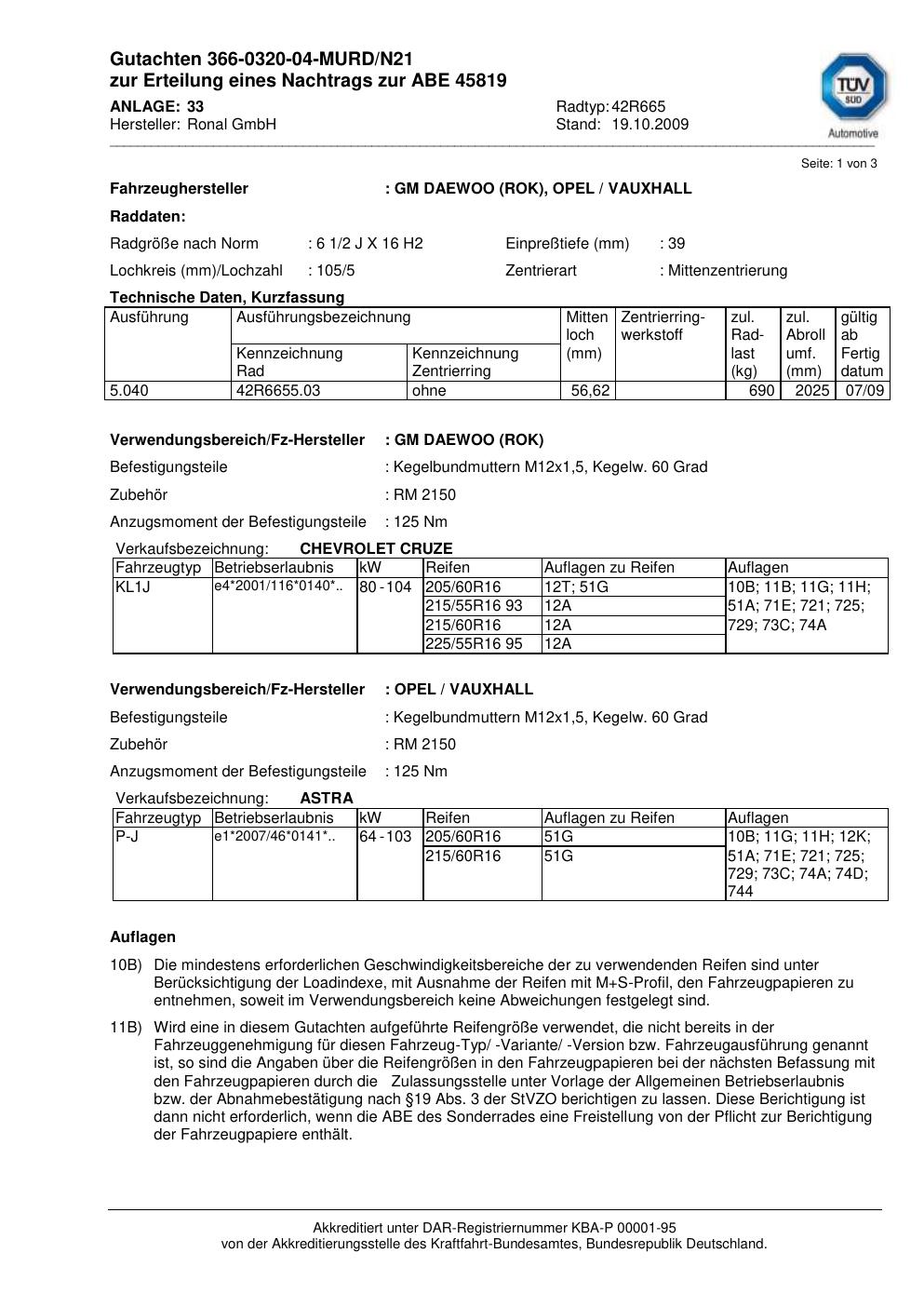 Dieses Gutachten (abe) bezieht sich auf die Alufelge Ronal 42R665 in der Ausführung 2Jx16 ET 0, Mittenloch 0 mm (KBA 45819). Im PDF findest du typischerweise zulässige Reifengrößen, Auflagen/Anbauhinweise und – je nach Dokument – Hinweise zur Eintragung.