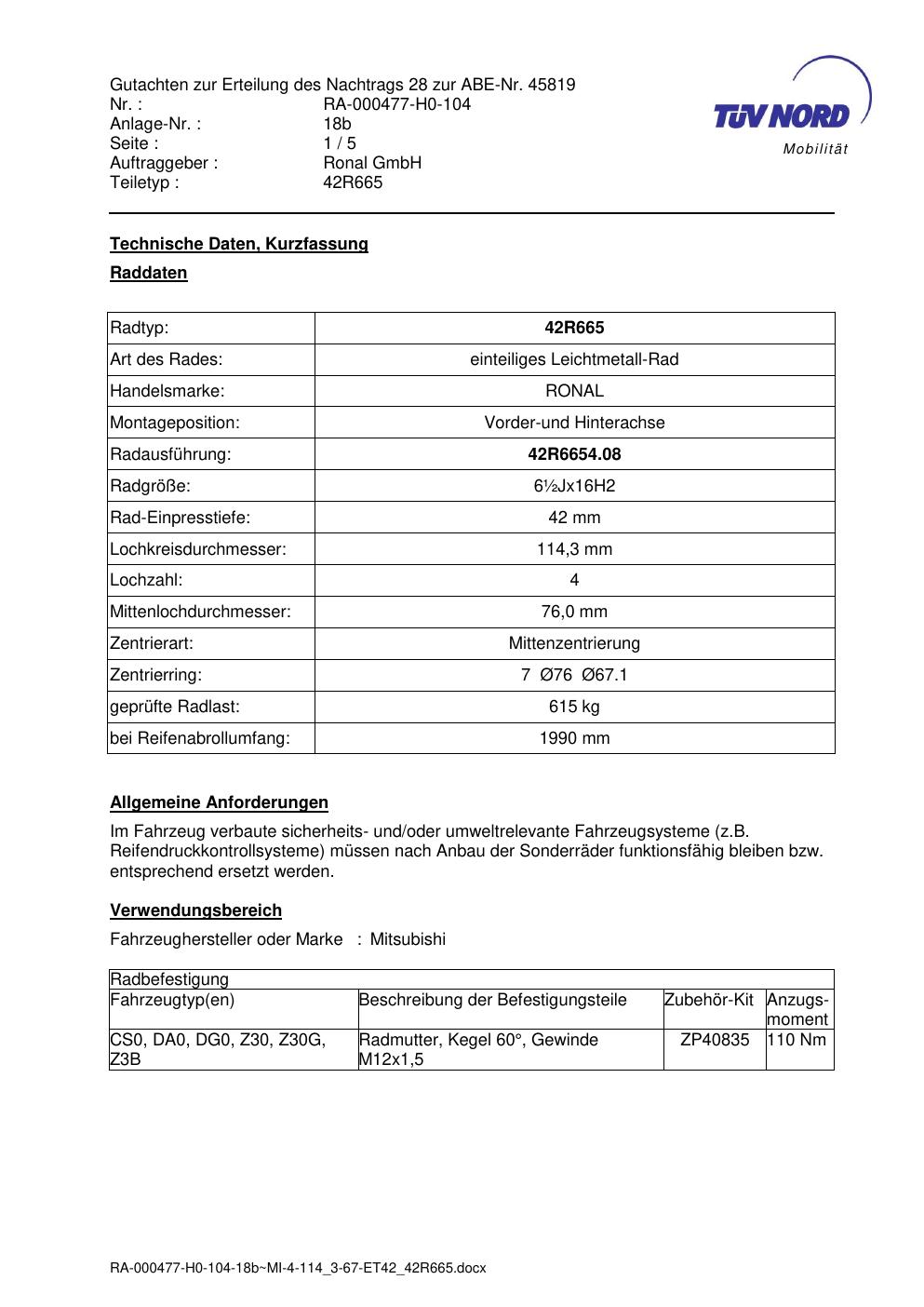 Dieses abe der Marke Ronal stammt vom jeweiligen Hersteller, Importeur oder einer Prüforganisation. Felgengutachten.de beansprucht hieran keine eigenen Urheber-, Nutzungs- oder sonstigen Schutzrechte. Soweit das Dokument urheber- oder leistungsschutzrechtlich geschützt ist, verbleiben die Rechte beim jeweiligen Rechteinhaber. Die Bereitstellung erfolgt ausschließlich zu Informationszwecken für Endnutzer, z. B. zur Vorlage bei Prüfstellen oder zur eigenen Fahrzeugdokumentation.