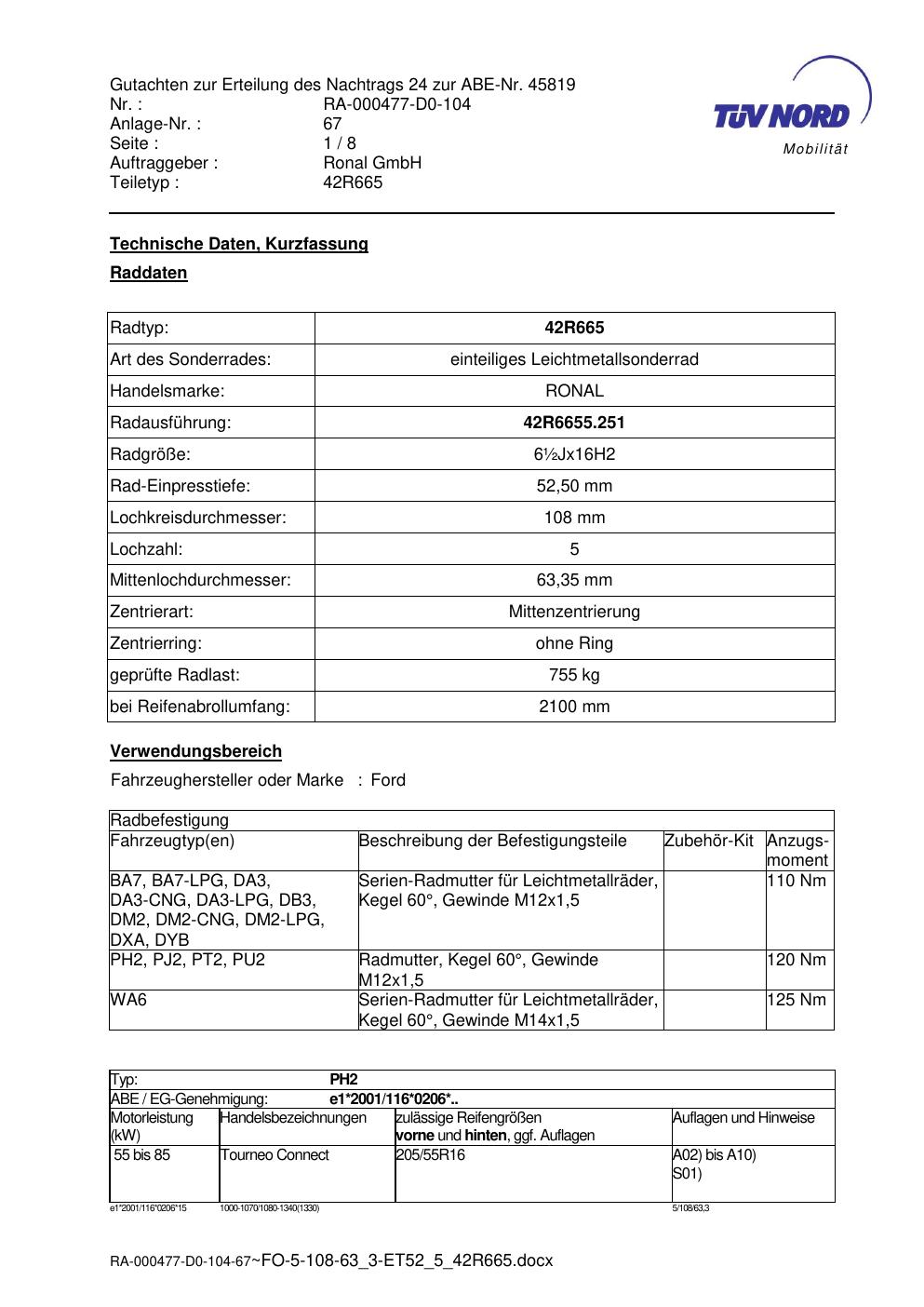 Dieses abe der Marke Ronal stammt vom jeweiligen Hersteller, Importeur oder einer Prüforganisation. Felgengutachten.de beansprucht hieran keine eigenen Urheber-, Nutzungs- oder sonstigen Schutzrechte. Soweit das Dokument urheber- oder leistungsschutzrechtlich geschützt ist, verbleiben die Rechte beim jeweiligen Rechteinhaber. Die Bereitstellung erfolgt ausschließlich zu Informationszwecken für Endnutzer, z. B. zur Vorlage bei Prüfstellen oder zur eigenen Fahrzeugdokumentation.