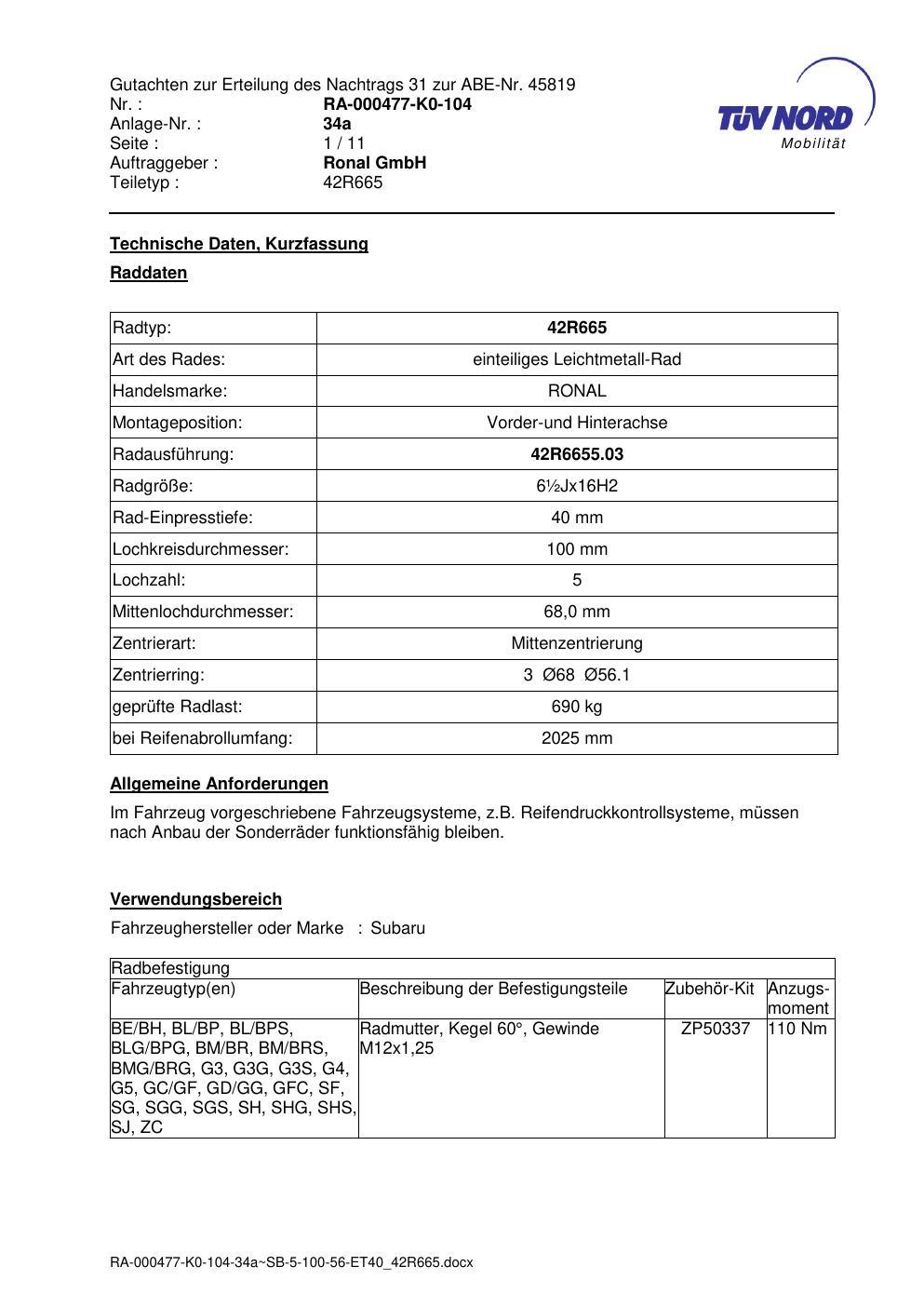 • Stimmt die KBA-Nummer auf der Felge mit diesem Dokument überein?