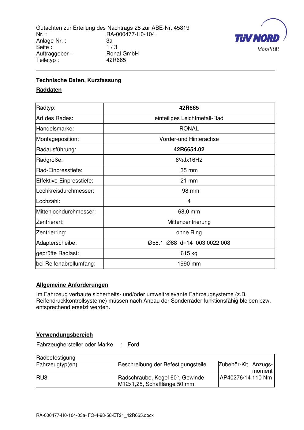 • Stimmt die KBA-Nummer auf der Felge mit diesem Dokument überein?