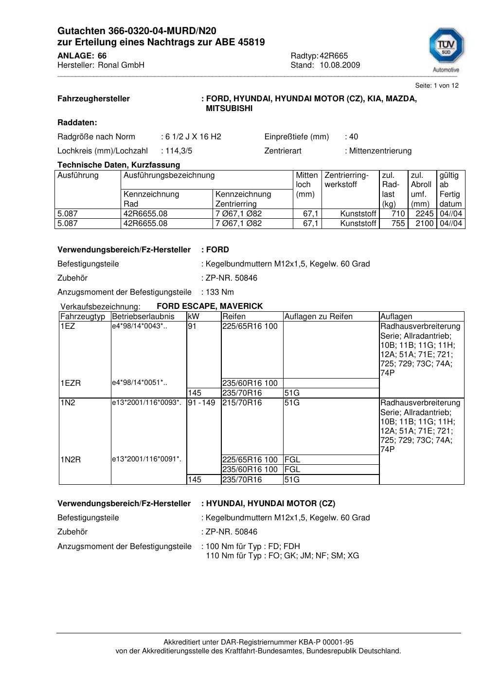 Felgengutachten / abe für Alufelgen Ronal 42R665 (2Jx16 ET 0, Mittenloch 0 mm) mit KBA 45819 (Zertifikatsnummer 45819). Hier kostenlos als PDF herunterladen. Der Download-Link ist 24 Stunden gültig und kann bis zu zwei Mal verwendet werden.