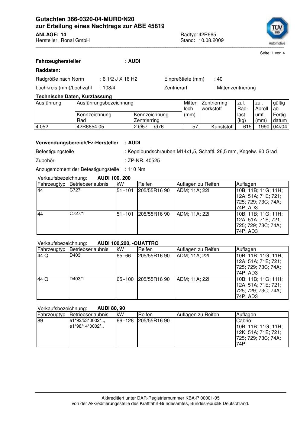 Felgengutachten / abe für Alufelgen Ronal 42R665 (2Jx16 ET 0, Mittenloch 0 mm) mit KBA 45819 (Zertifikatsnummer 45819). Hier kostenlos als PDF herunterladen. Der Download-Link ist 24 Stunden gültig und kann bis zu zwei Mal verwendet werden.