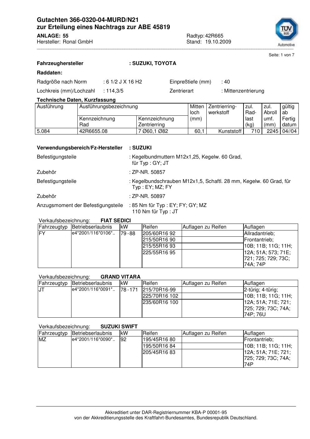 Dieses Gutachten (abe) bezieht sich auf die Alufelge Ronal 42R665 in der Ausführung 2Jx16 ET 0, Mittenloch 0 mm (KBA 45819). Im PDF findest du typischerweise zulässige Reifengrößen, Auflagen/Anbauhinweise und – je nach Dokument – Hinweise zur Eintragung.