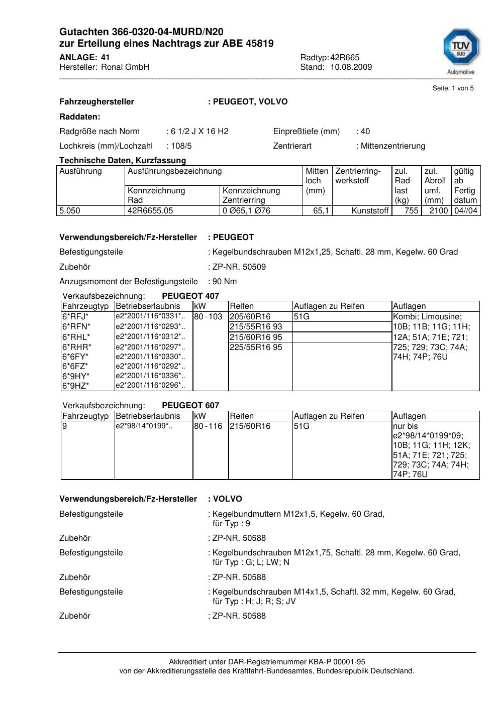 Felgengutachten / abe für Alufelgen Ronal 42R665 (2Jx16 ET 0, Mittenloch 0 mm) mit KBA 45819 (Zertifikatsnummer 45819). Hier kostenlos als PDF herunterladen. Der Download-Link ist 24 Stunden gültig und kann bis zu zwei Mal verwendet werden.