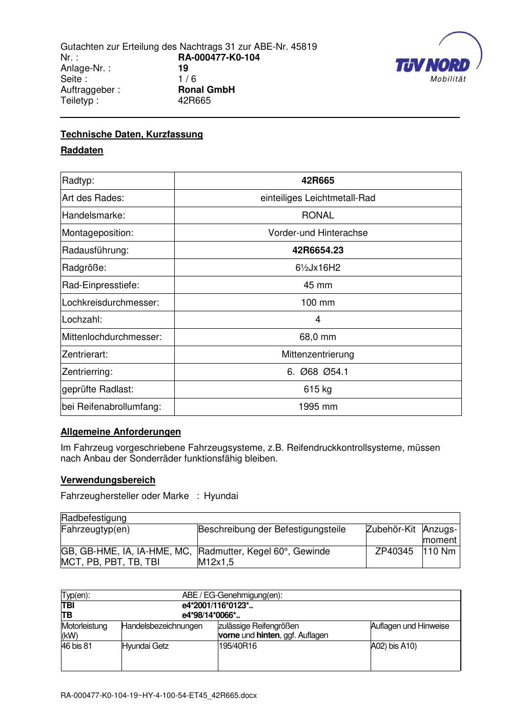 • Stimmt die KBA-Nummer auf der Felge mit diesem Dokument überein?