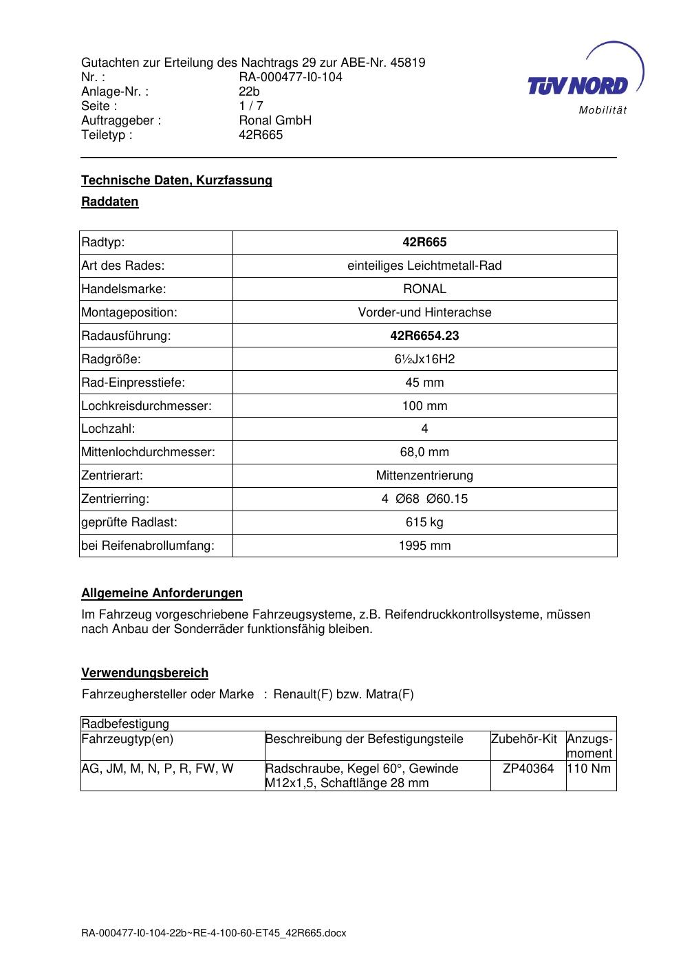Dieses abe gehört zur Felge Ronal 42R665 in ET0 mit KBA 45819. Die Seite ist dafür gedacht, dass du schnell prüfen kannst, ob KBA, Design und Größe zu deiner Felge passen und danach direkt das richtige PDF lädst.